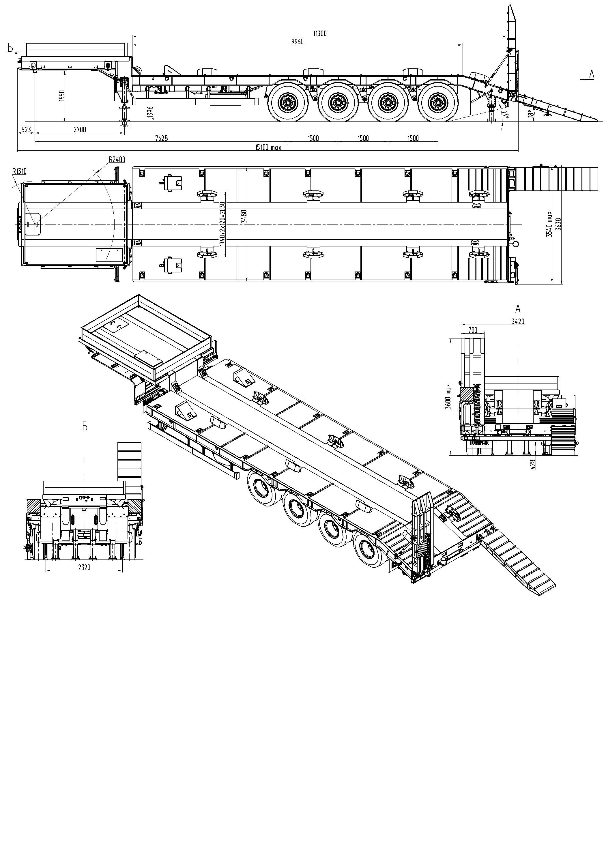 95000 кг, шины 14,00R20/16+1, платформа 9960 (11300 до трапов) x 3480 мм, , ССУ 1510 мм, рессорная подвеска