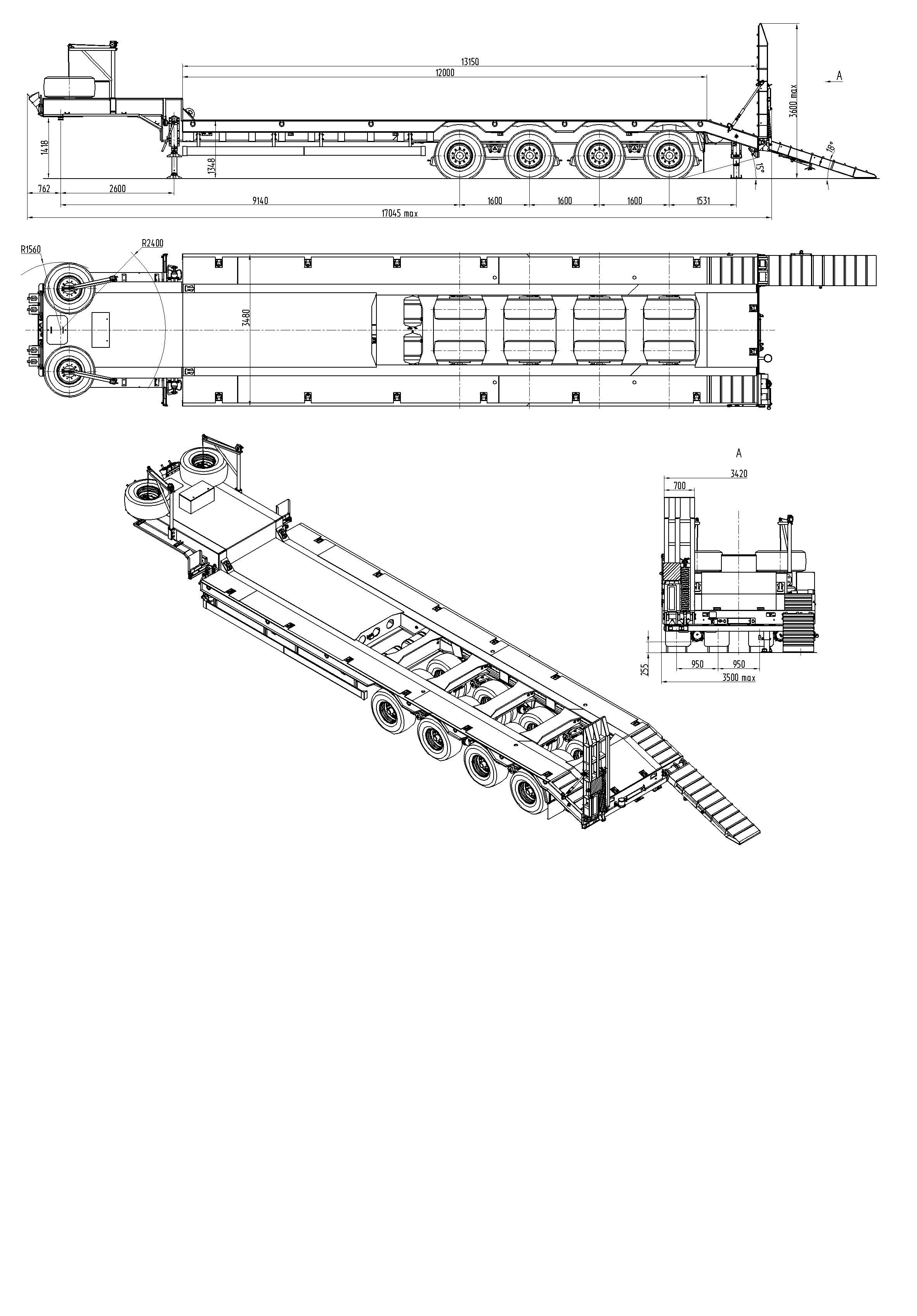 105000 кг, шины 445/65R22,5/16+1, платформа 12000 (13150 до трапов) x 3480 мм, ССУ 1418 мм, балансирная подвеска