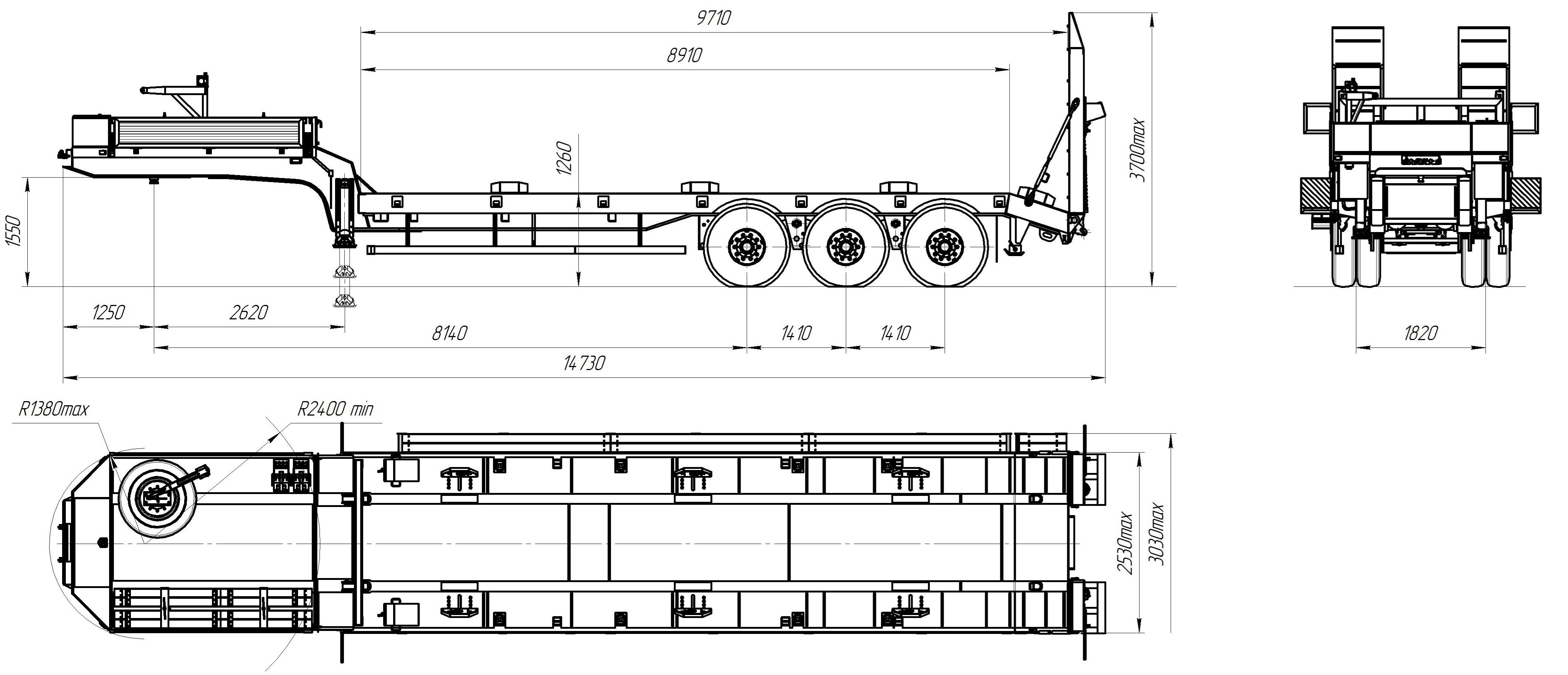60000 кг, шины 12,00R20/12+1, платформа 9500 (10700 до трапов) x 2530 мм (уширители до 3030 мм), ССУ 1510 мм, рессорная подвеска