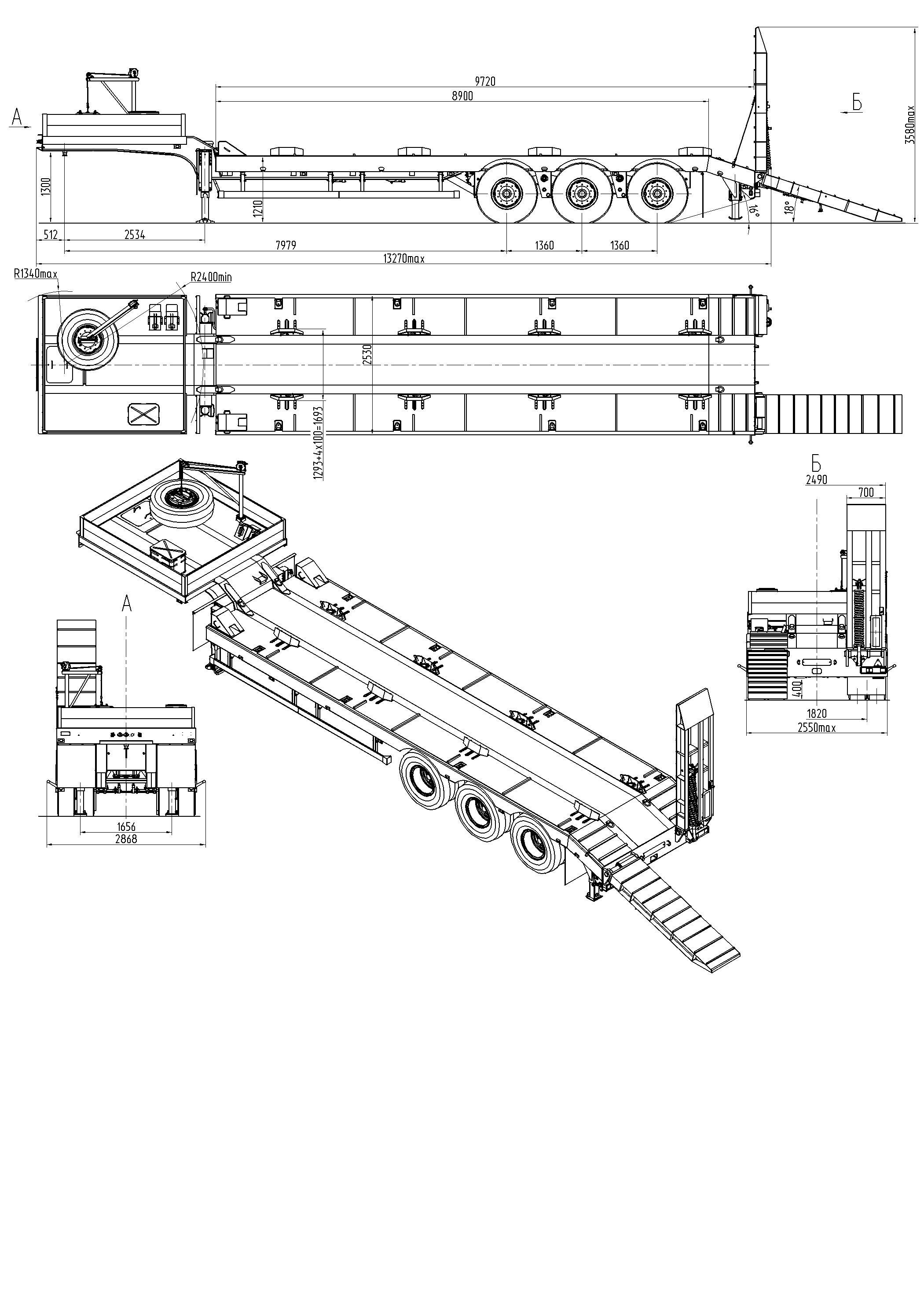 42500 кг, шины 12,00R20/12+1, платформа 8901 (9700 до трапов) x 2530 мм, уширители до 3030, съемные стойки, ССУ 1510 мм, рессорная подвеска