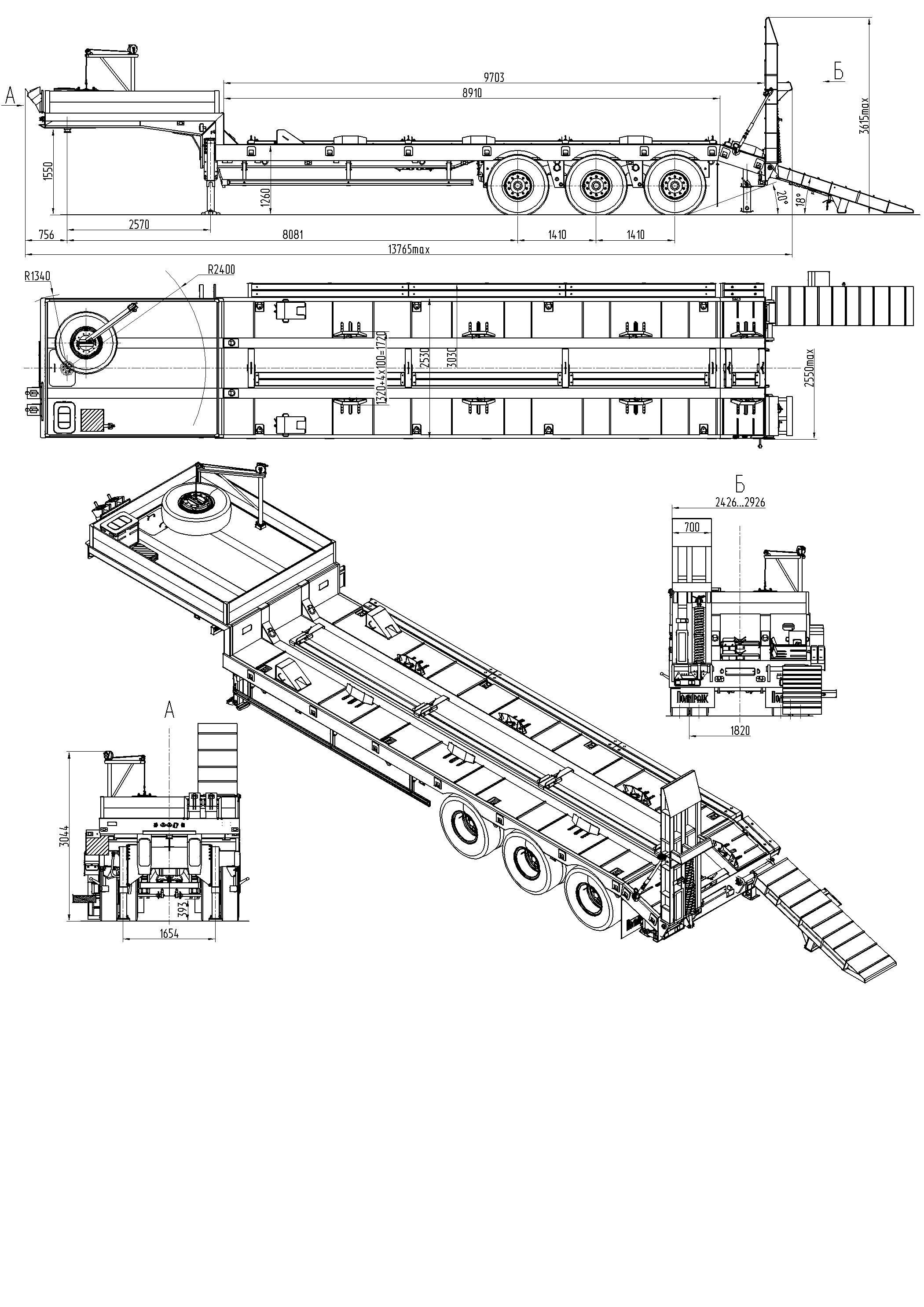 50500 кг, шины 12,00-20/12+1, платформа 8910 (9705 до трапов) x 3000 мм с уширителями до 3500 мм, ССУ 1485 мм, съемные стойки, рессорная подвеска