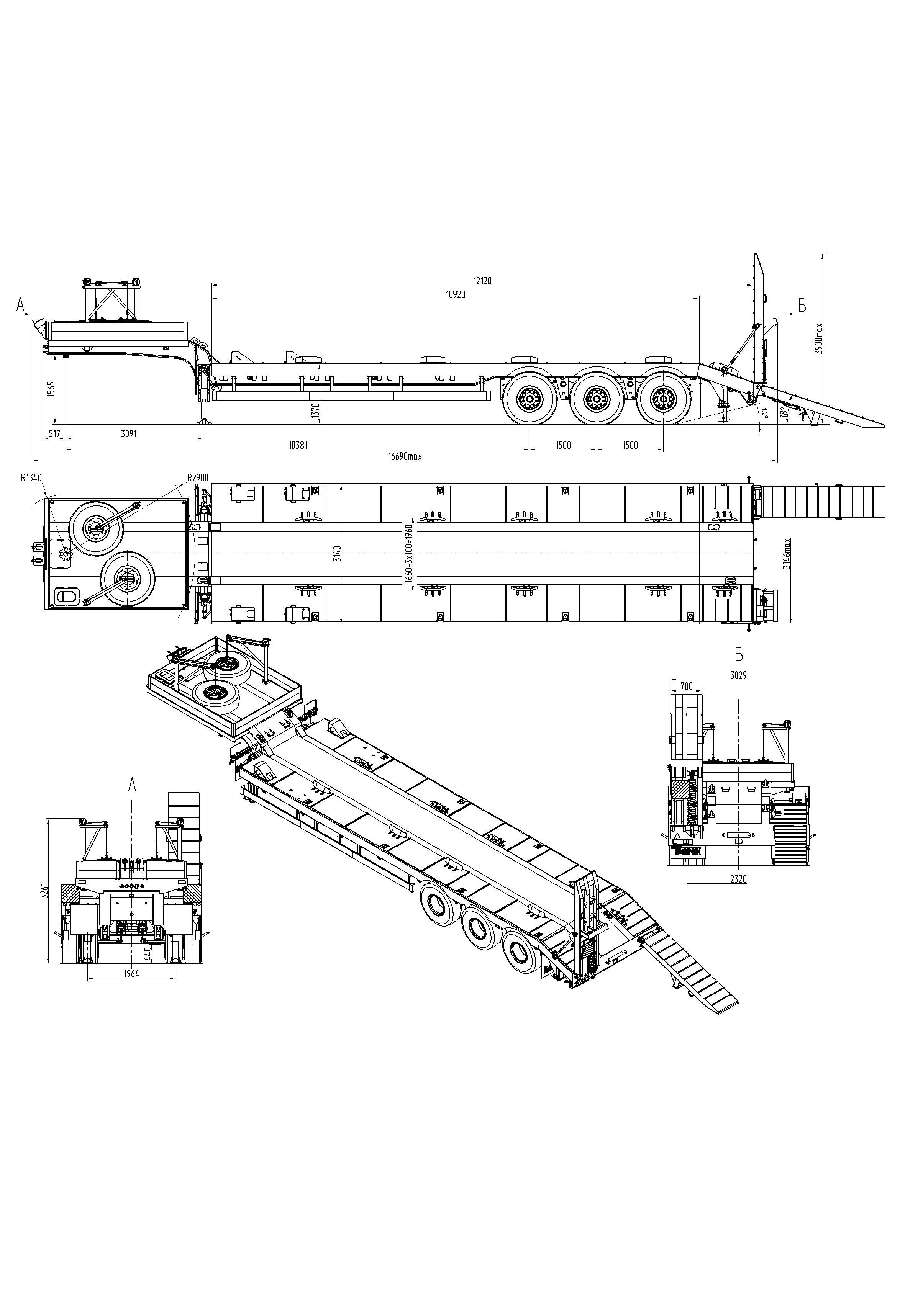 71600 кг, шины 14,00R20/12+1, платформа 12000 (13201 до трапов) x 3140 мм, уширители до 3640 мм, съемные стойки, ССУ 1550 мм, рессорная подвеска