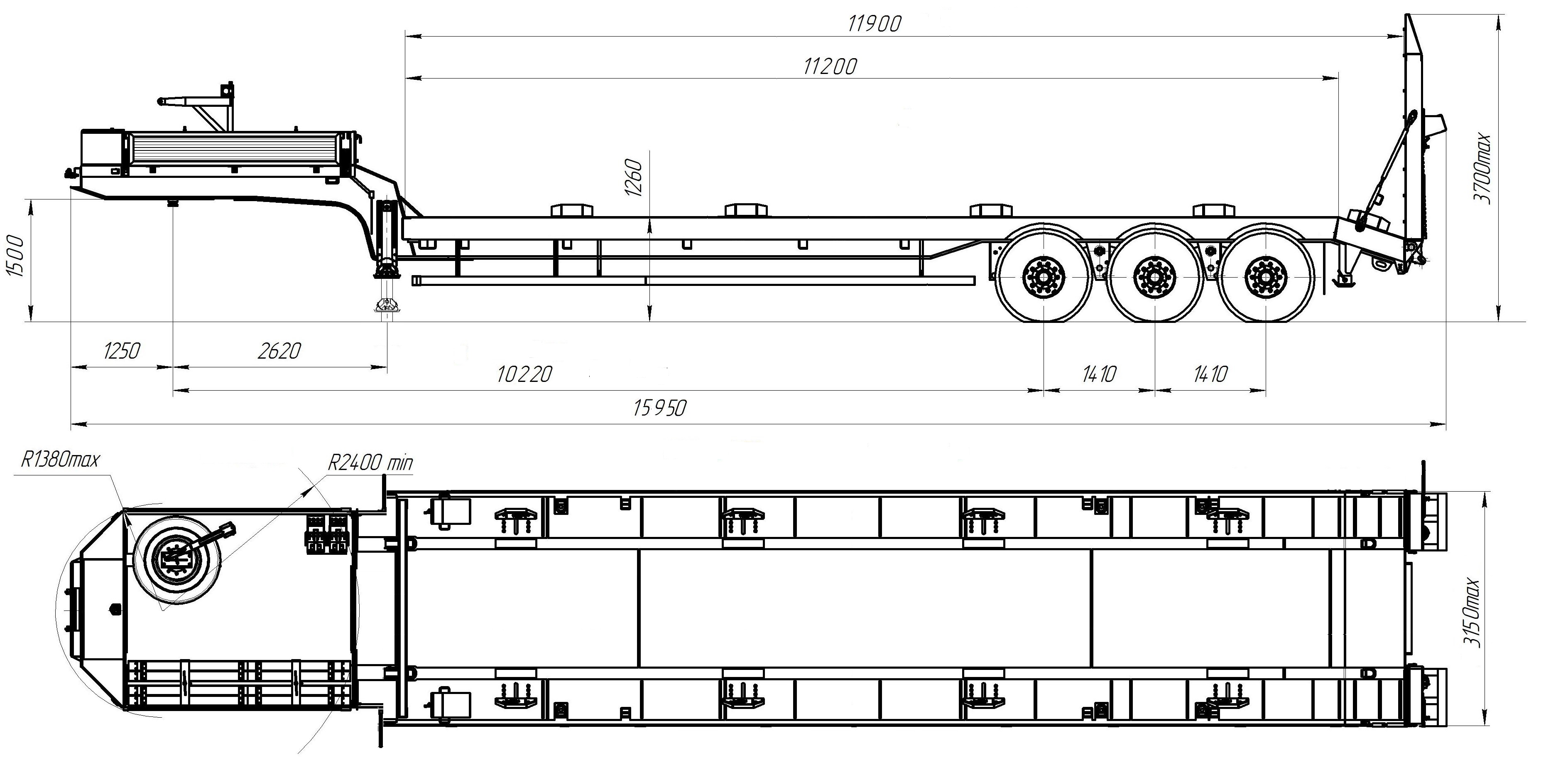 40200 кг, шины 12,00R20 / 12+1, платформа 11370(12166 до трапов) x 3140 мм, съемные стойки, ССУ 1550 мм, рессорная подвеска