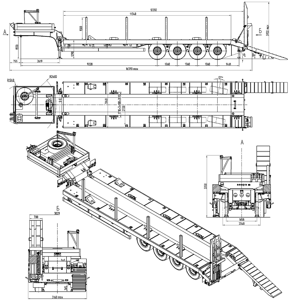 50000 кг, шины 385/65R22,5 или 445/65R22,5/ 6+1, присавные алюминиевые трапы, платформа 12200 мм, ССУ 1450 мм, пневматическая подвеска, раздвижные коники 1500 мм, съемные борта или без них, в ГАБАРИТЕ по ДЛИНЕ АВТОПОЕЗДА с КАМАЗ 6x6