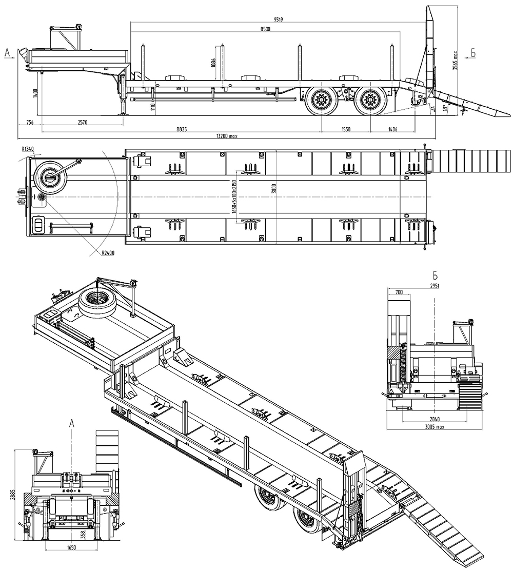 21000 кг, шины 385/65R22,5/4+1, платформа 8500 (9319 до трапов) x 3000 мм, ССУ 1400-1500 мм, рессорная или пневматическая подвеска, съемные стойки