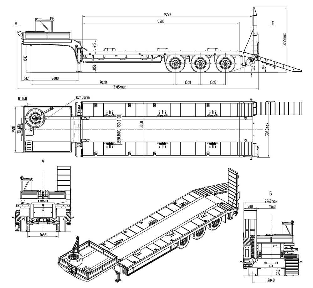 41200 кг, шины 395/85R20 или 445/65R22,5 / 6+1, платформа 9280 (10142 до трапов) x 2530 с уширителями до 3030 мм, ССУ 1550 мм, рессорная или пневматическая подвеска, раздвижные коники