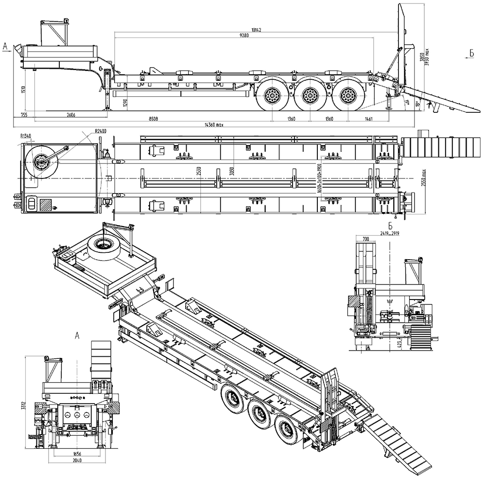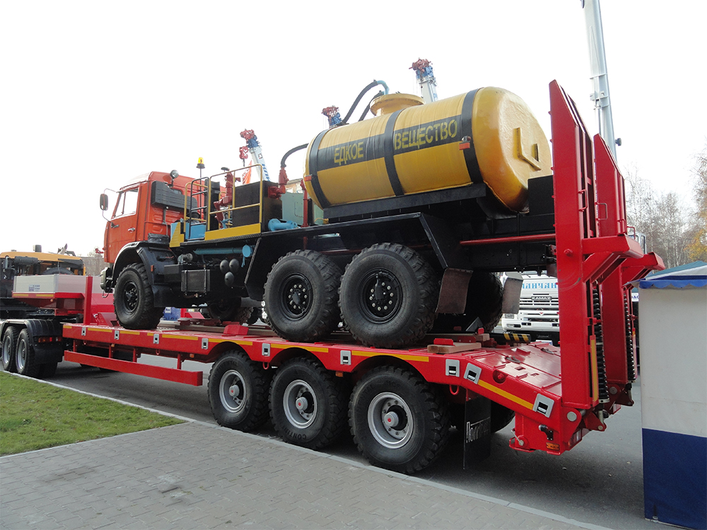 42100 кг, шины 395/85R20 или 445/65R22,5 / 6+1, платформа 9280 (10142 до трапов) x 2530 с уширителями до 3030 мм, ССУ 1510 мм, рессорная или пневматическая подвеска