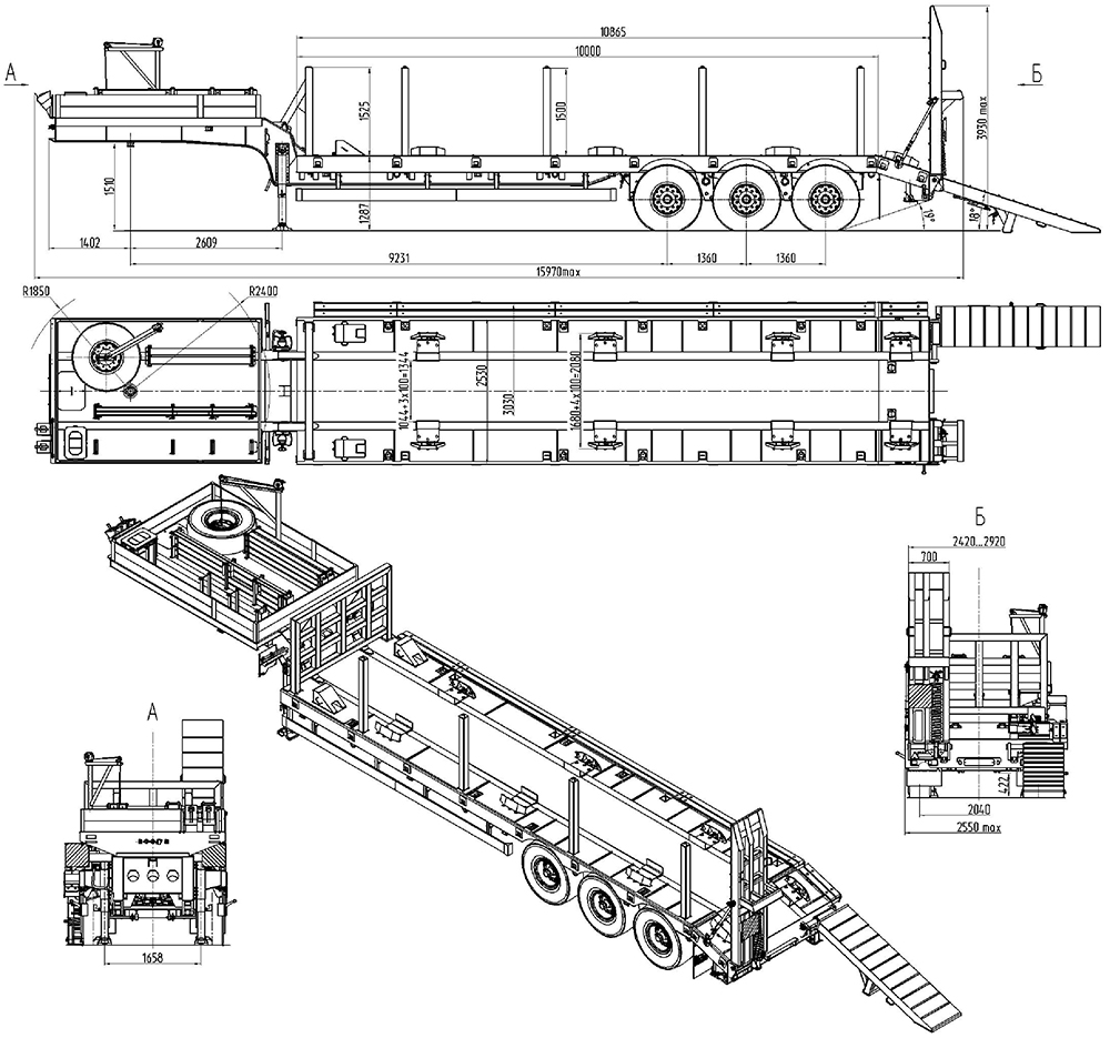 40500 кг, шины 395/85R20 или 445/65R22,5 / 6+1, платформа 10000 (10865 до трапов) x 2530 с уширителями до 3030 мм, ССУ 1510 мм, рессорная или пневматическая подвеска, съемные стойки, передний щит