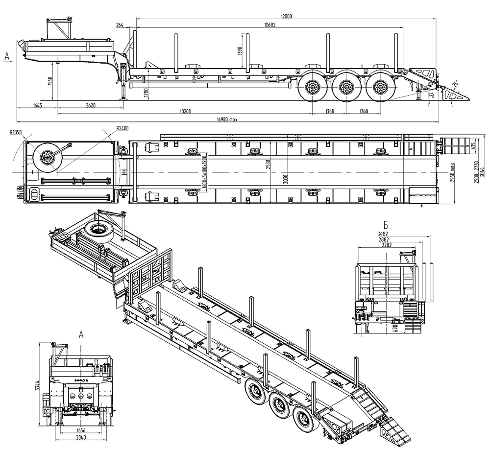 45000 кг, шины 445/65R22,5 или 395/85R20 / 6+1, платформа 10300 (11080 до трапов) x 2500 с уширителями до 3000 мм, механические трапы, ССУ 1510 мм, пневматическая или рессорная подвеска, съемные стойки 1500 мм, съемные борта
