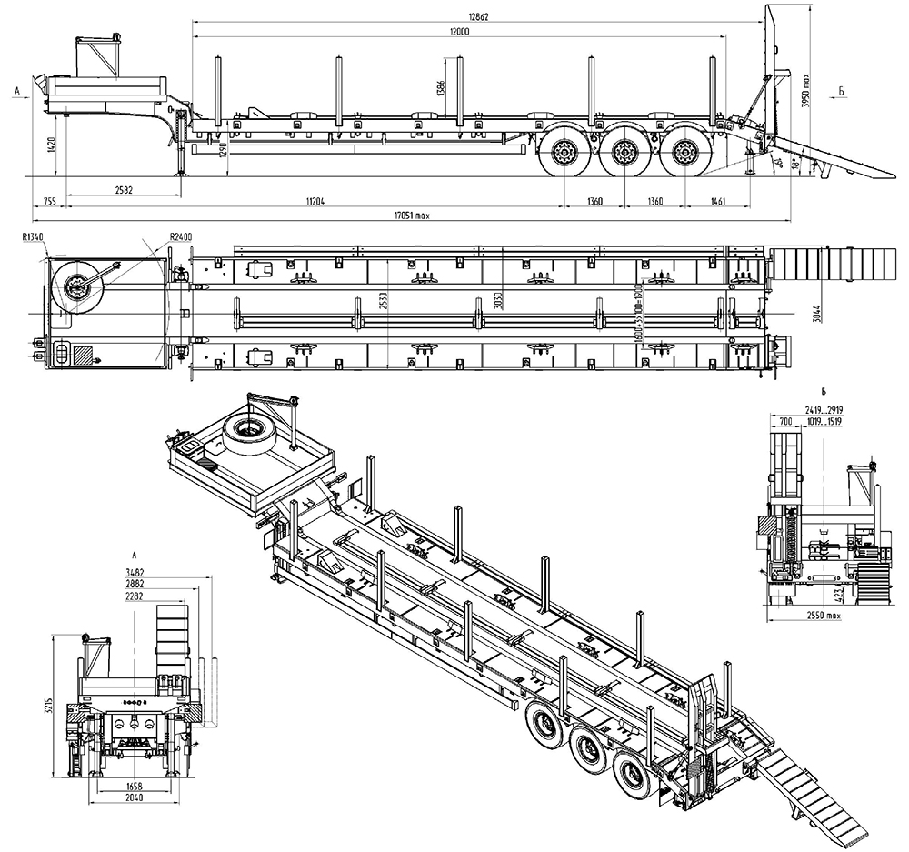 44700 кг, шины 395/85R20 или 445/65R22,5 / 6+1, платформа 12000 (12862 до трапов) x 2530 с уширителями до 3030 мм, ССУ 1420 мм, рессорная или пневматическая подвеска, раздвижные коники, механические трапы с пружиной