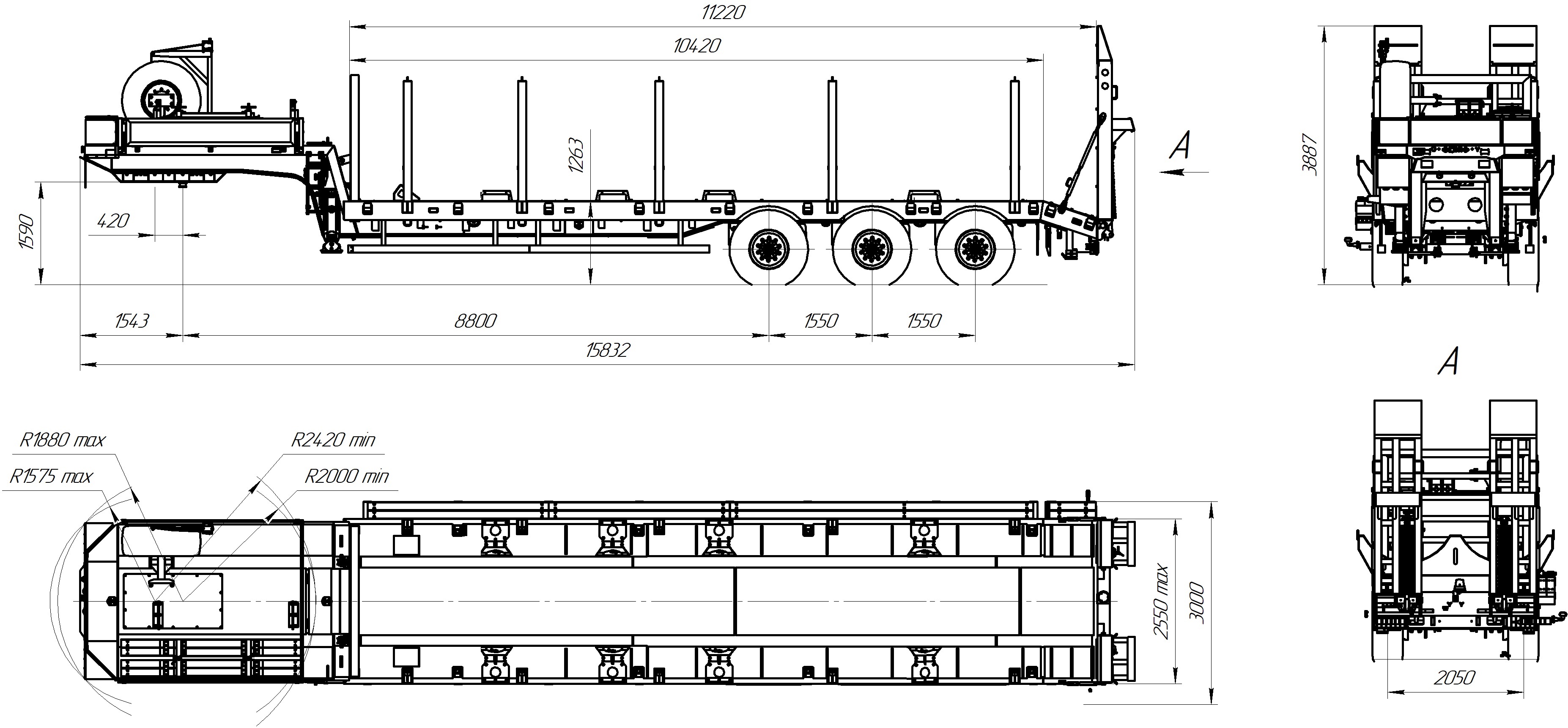 45000 кг, шины 445/65R22,5 или 395/85R20 / 6+1, платформа 10300 (11080 до трапов) x 2500 с уширителями до 3000 мм, приставные алюминиевые трапы, ССУ 1510 мм, рессорная подвеска, съемные стойки 1500 мм, съемные борта