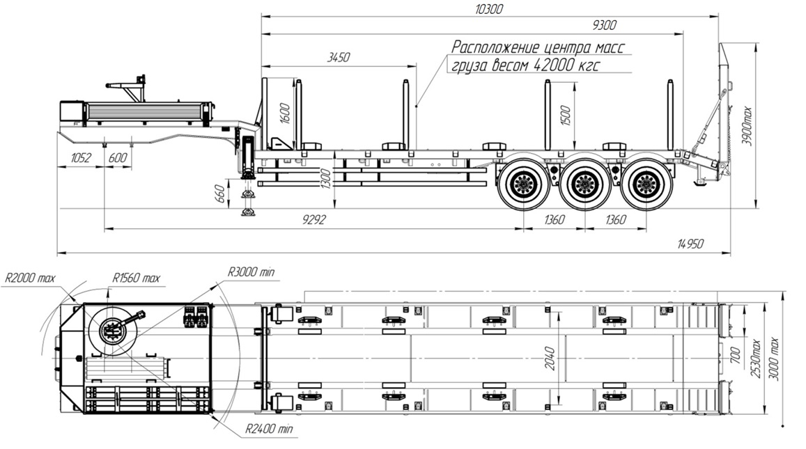 47000 кг, шины 445/65R22.5 или 395/85R20 / 6+1, платформа 9300 (10300 до трапов) x 2500 с уширителями до 3000 мм, механические трапы, пневматическая подвеска, съемные стойки 1500 мм