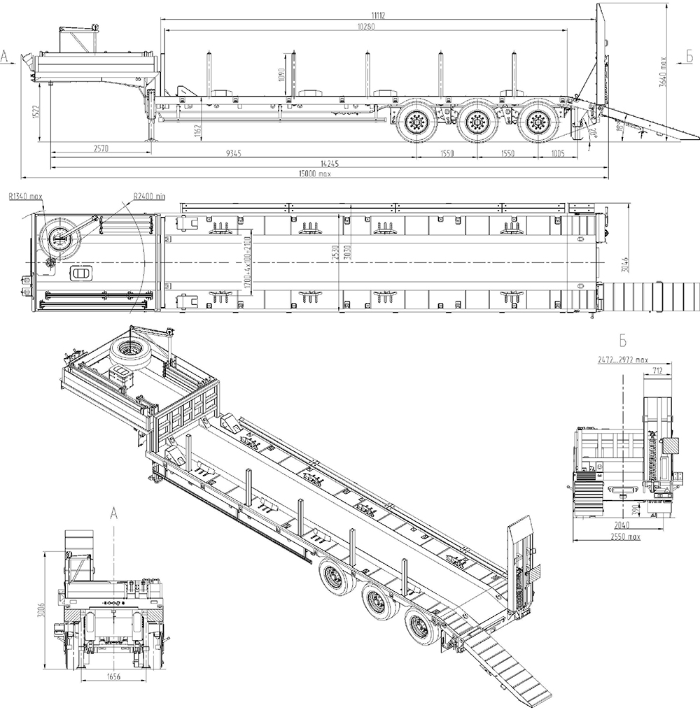 39000 кг, шины 385/65R22,5 или 445/65R22,5 / 6+1, платформа 11461 по трапам x 2500 с уширителями до 3000 мм, треугольные аппарели, ССУ 1430 мм, рессорная подвеска, съемные стойки или раздвижные коники 1500 мм, с бортами или без
