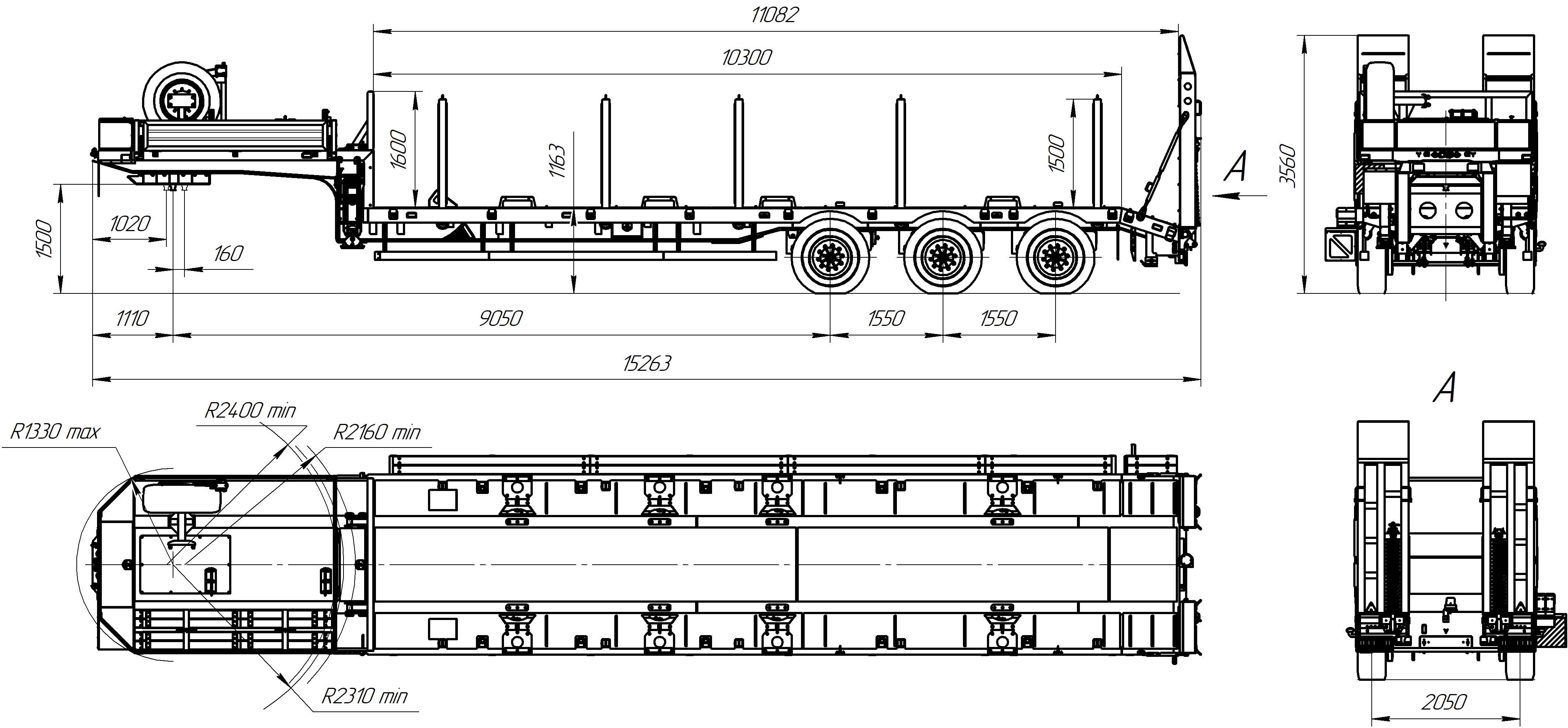 39000 кг, шины 385/65R22,5 или 445/65R22,5 / 6+1, платформа 11080 до трапов) x 2500 с уширителями до 3000 мм, ССУ 1510 мм, рессорная подвеска, съемные стойки 1500 мм, механические трапы