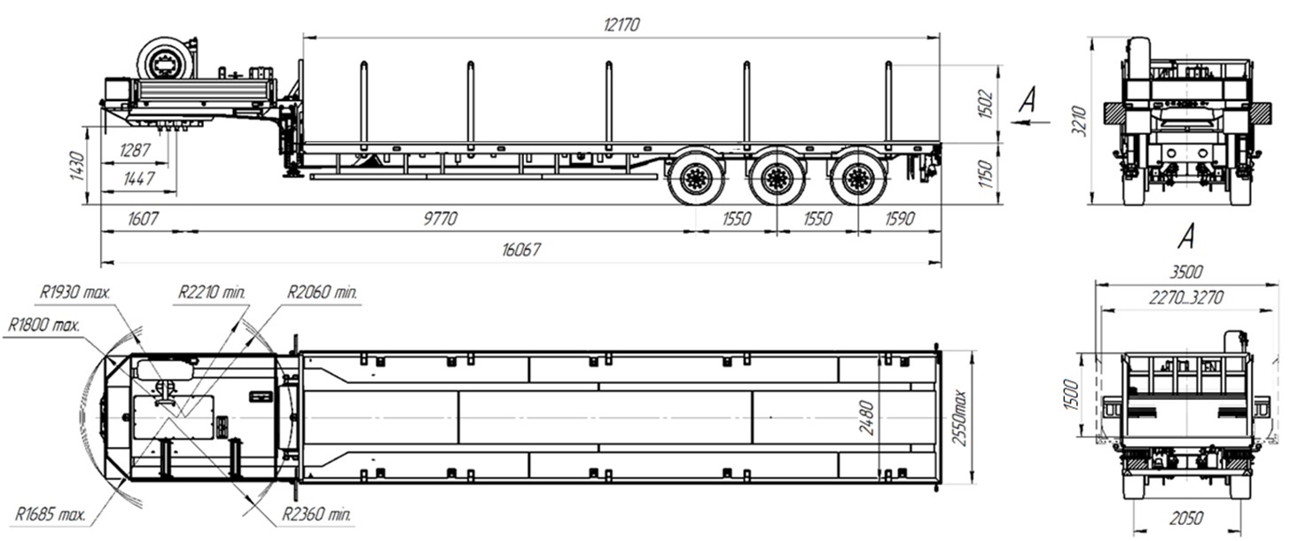 33500 кг, шины 385/65R22,5/6+1, платформа 8500 (9227 до трапов) x 2530 с уширителями до 3030 мм, ССУ 1510 мм, рессорная или пневматическая подвеска, съемные стойки