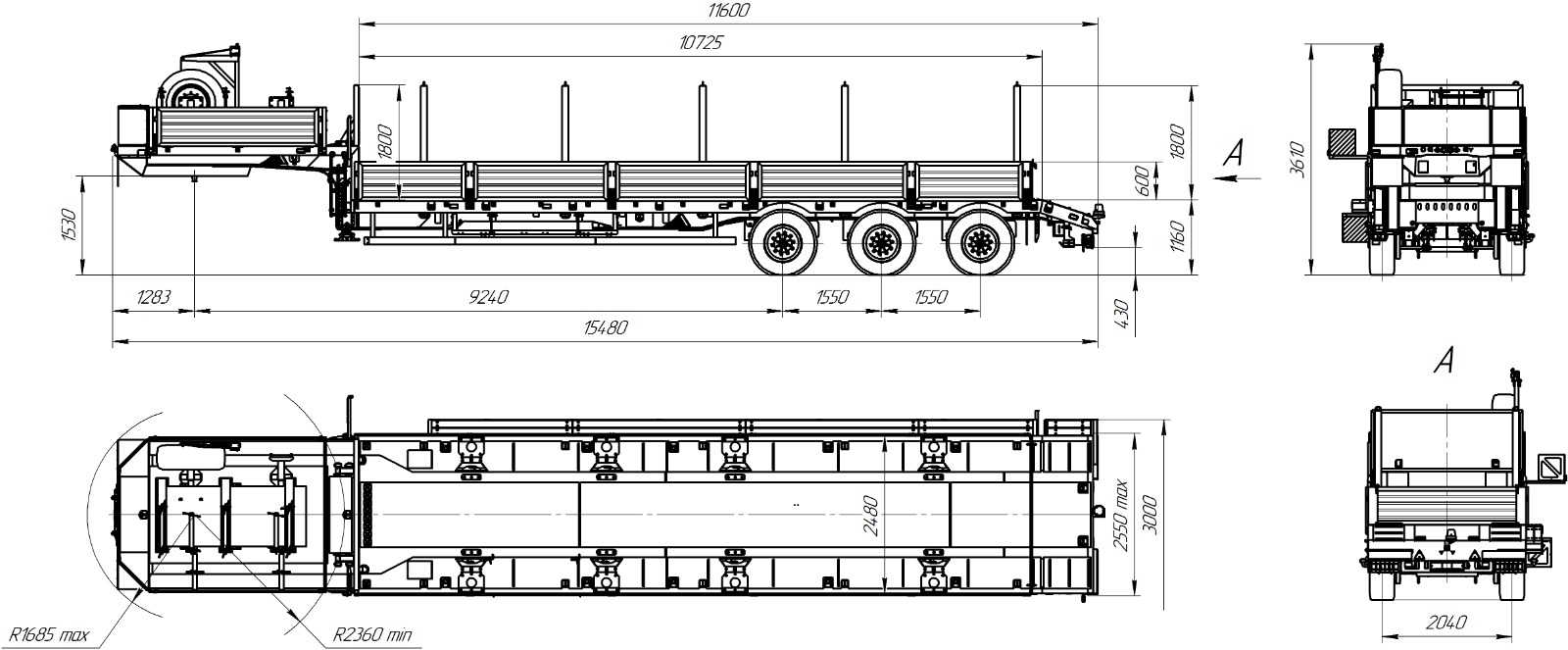 39000 кг, шины 385/65R22,5 или 445/65R22,5 / 6+1, платформа 11600 (по заднему свесу) x 2500 с уширителями до 3000 мм, приставные алюминиевые трапы, ССУ 1530 мм, пневматическая или рессорная подвеска, раздвижные коники 1500 мм, с бортами или без
