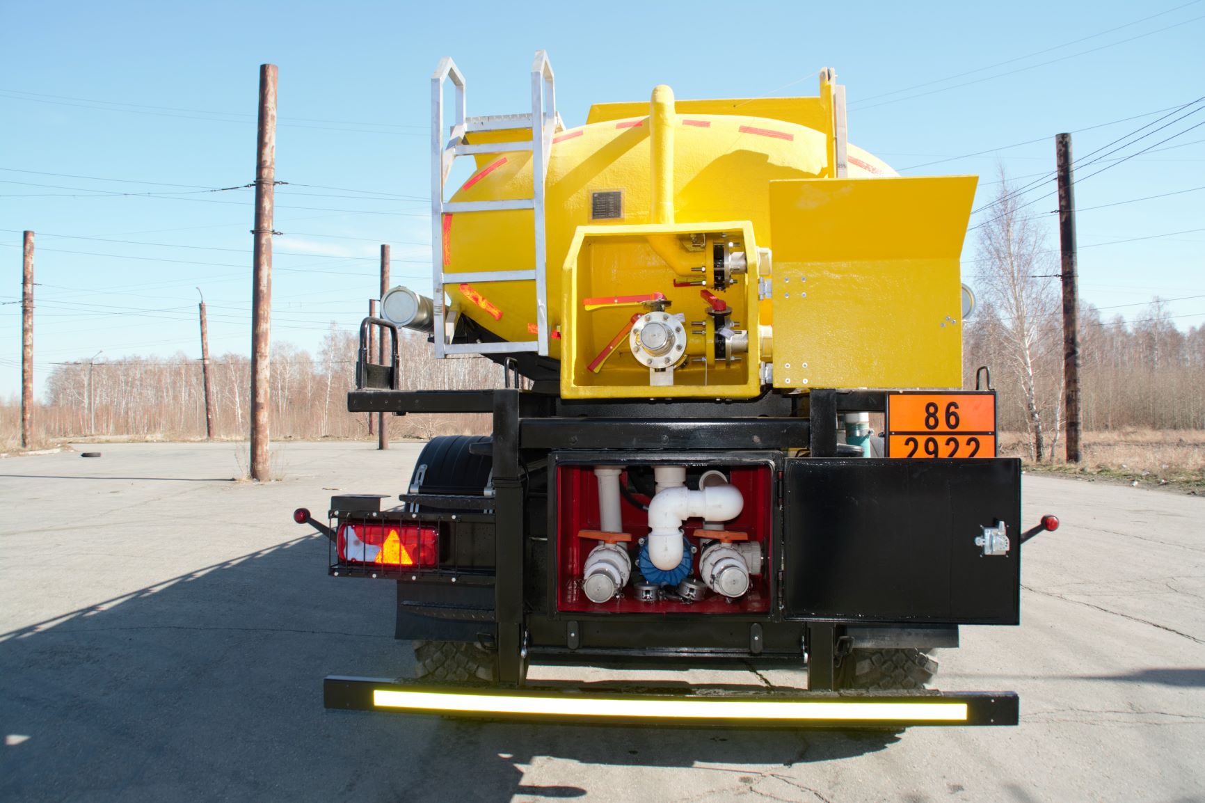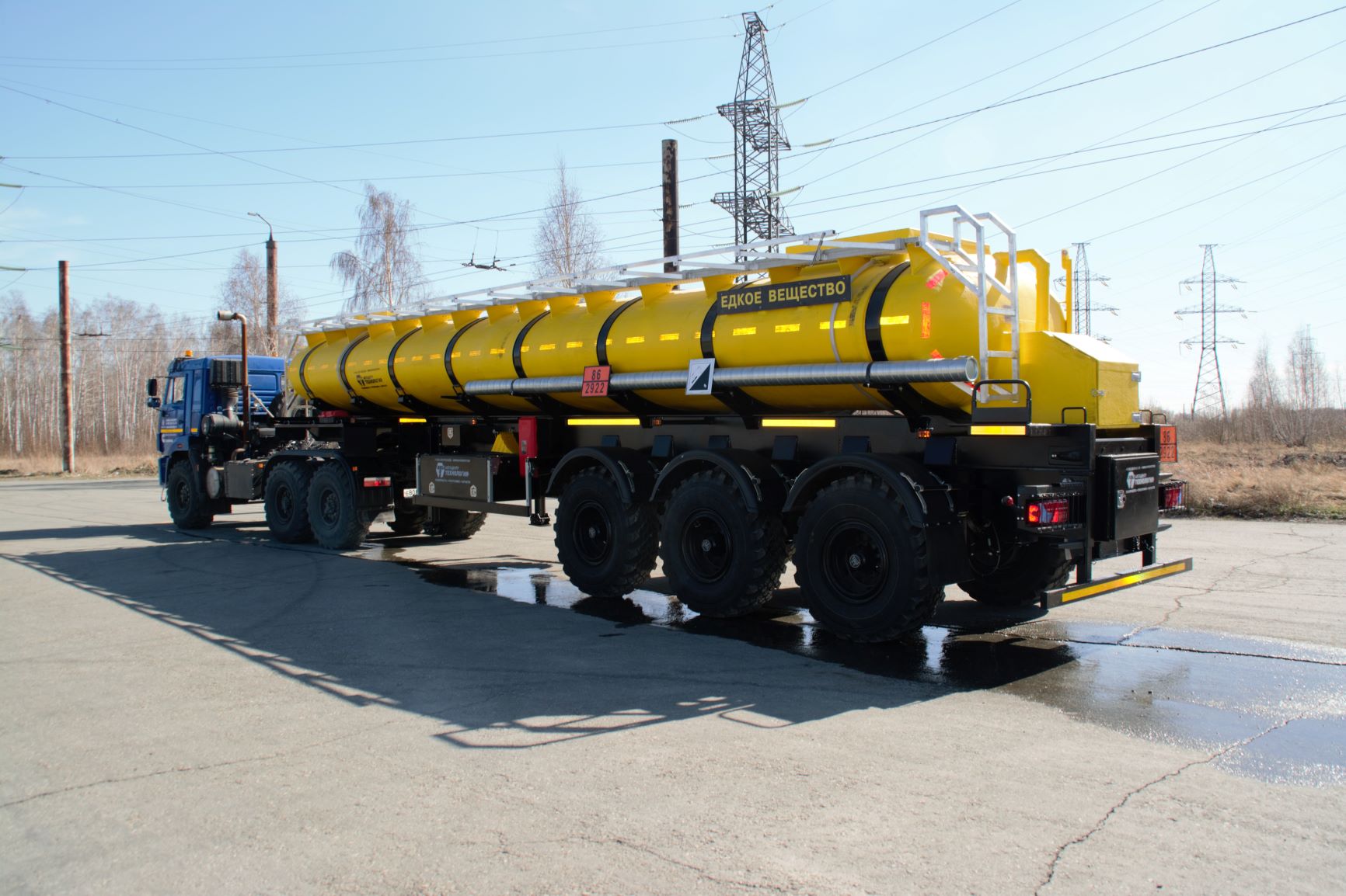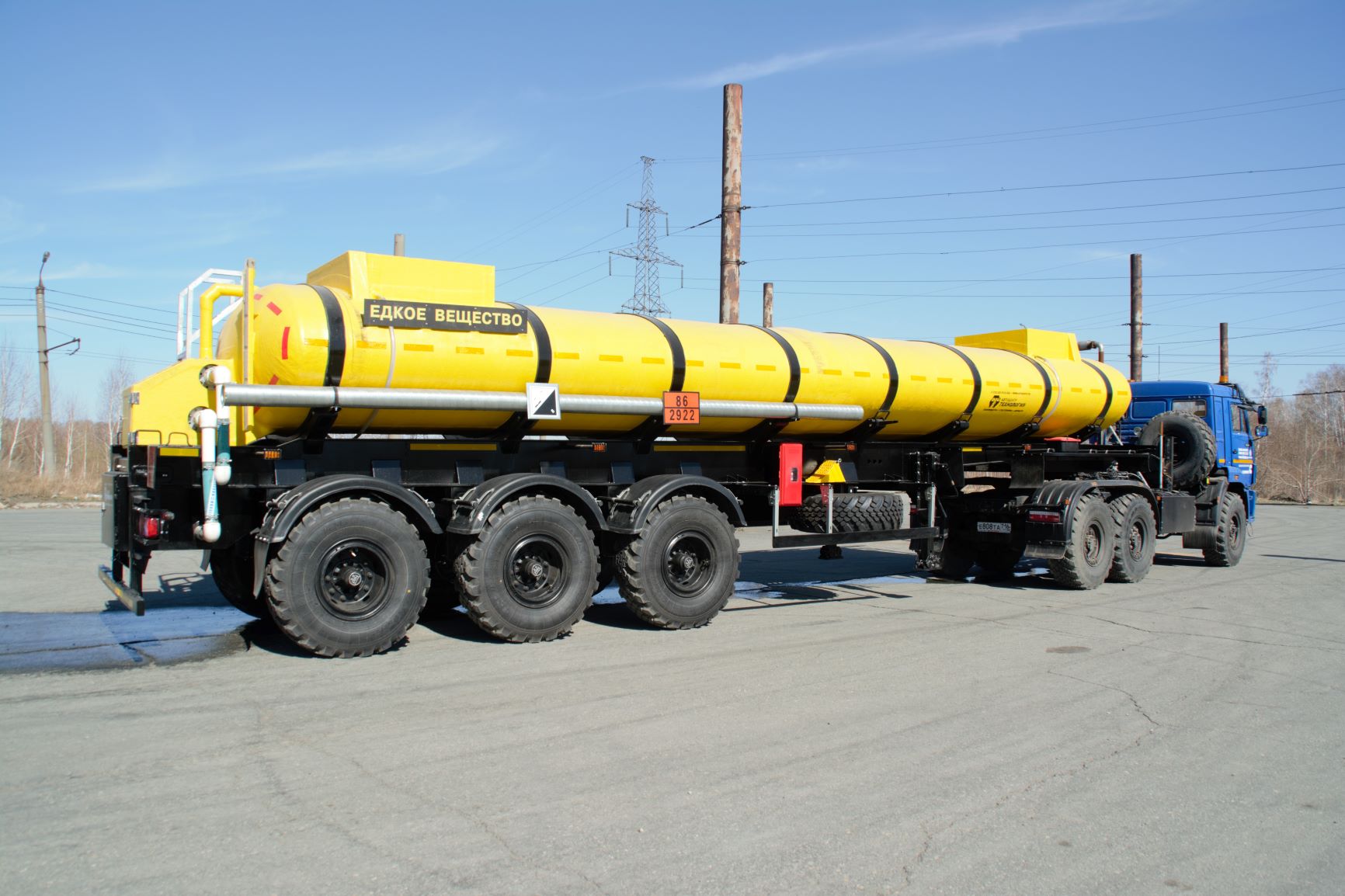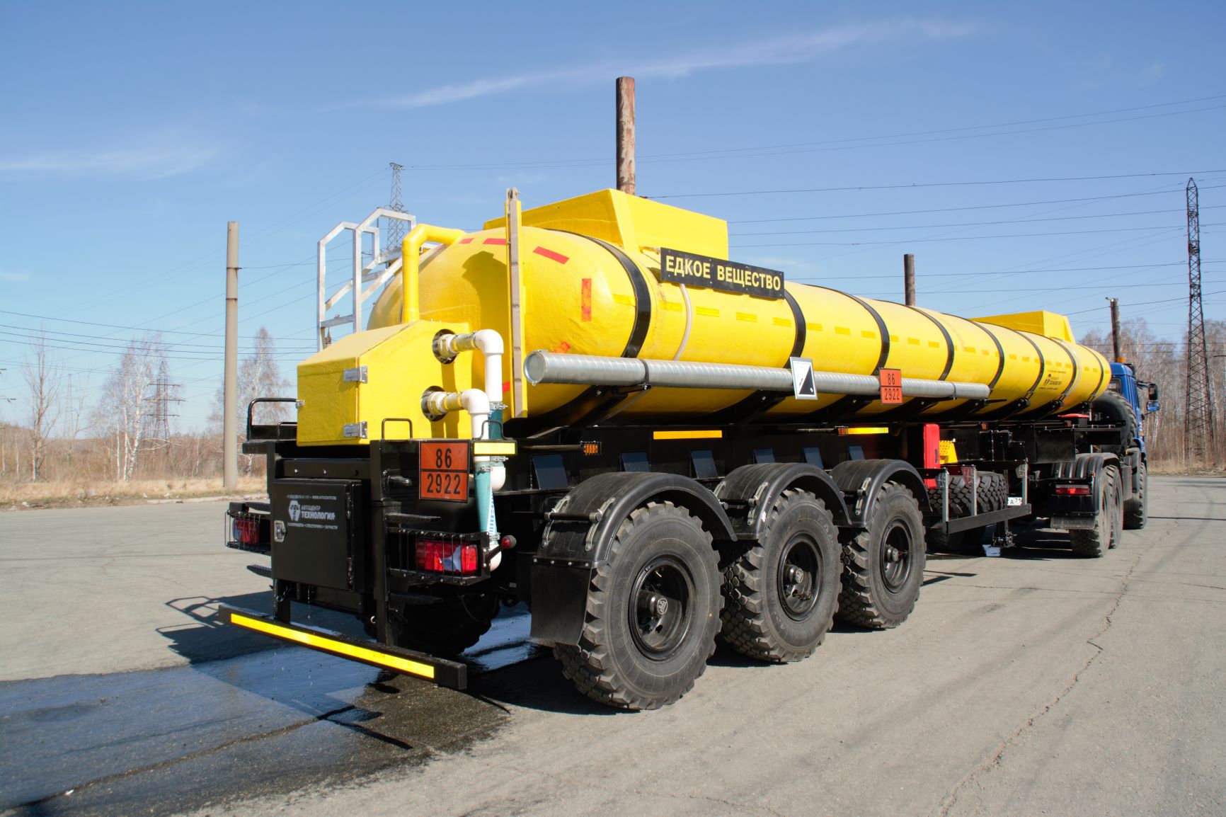 Материал: химстойкое стекловолокно, емкость: 22 куб.м., сечение: эллипсное, конструкция: однослойная или трехслойная (волокно, утеплитель, волокно), крепление: при помощи стяжных лент, перевозимые жидкости: кислоты/едкие вещества/нефть/техвода/щелочные и солевые растворы, автошины 425/85R21