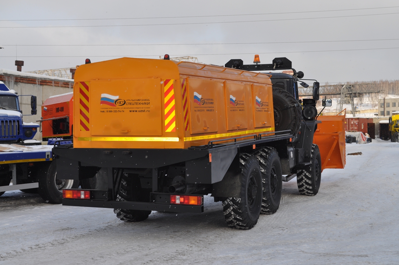 УРАЛ 4320-4972-80 со спальным местом, объем емкости 12,0 куб.м., подогрев емкости, утепление емкости 100 мм, сталь 09Г2С, сечение цистерны чемоданное, насос для закачки и выкачки воды, подогрев насоса, передний гидроповоротный отвал с увеличенной шириной очистки, задняя поливомоечная рейка с подогревом, подогрев гидросистемы, подогрев топливной системы, подогрев насоса.