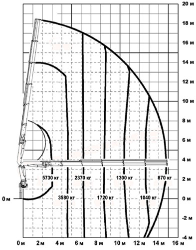 вылет 14,6 м, грузовой момент 17,20 тм, грузоподъемность 5730 кг