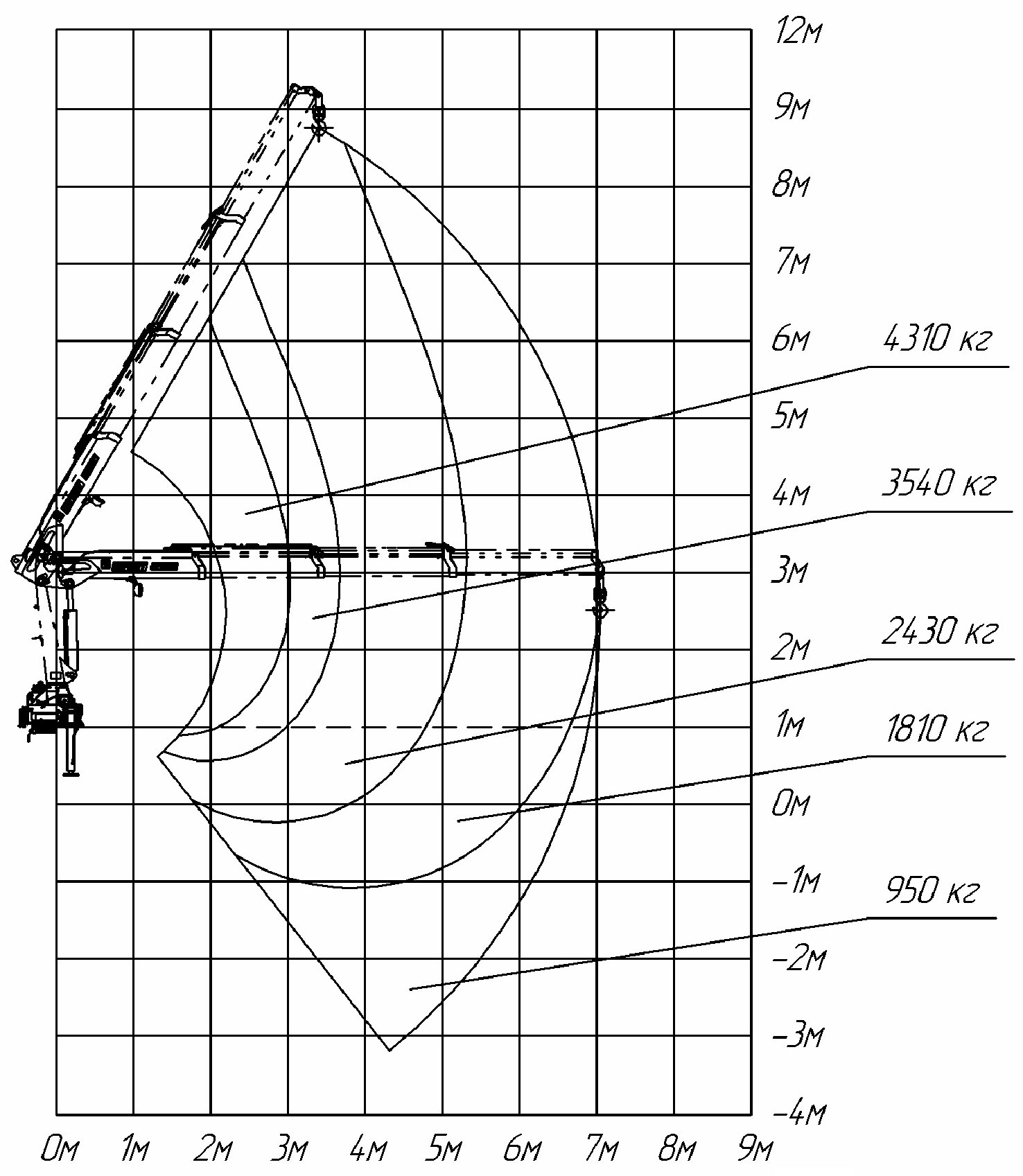 вылет 7,00 м, грузовой момент 12,93 тм, грузоподъемность 4310 кг