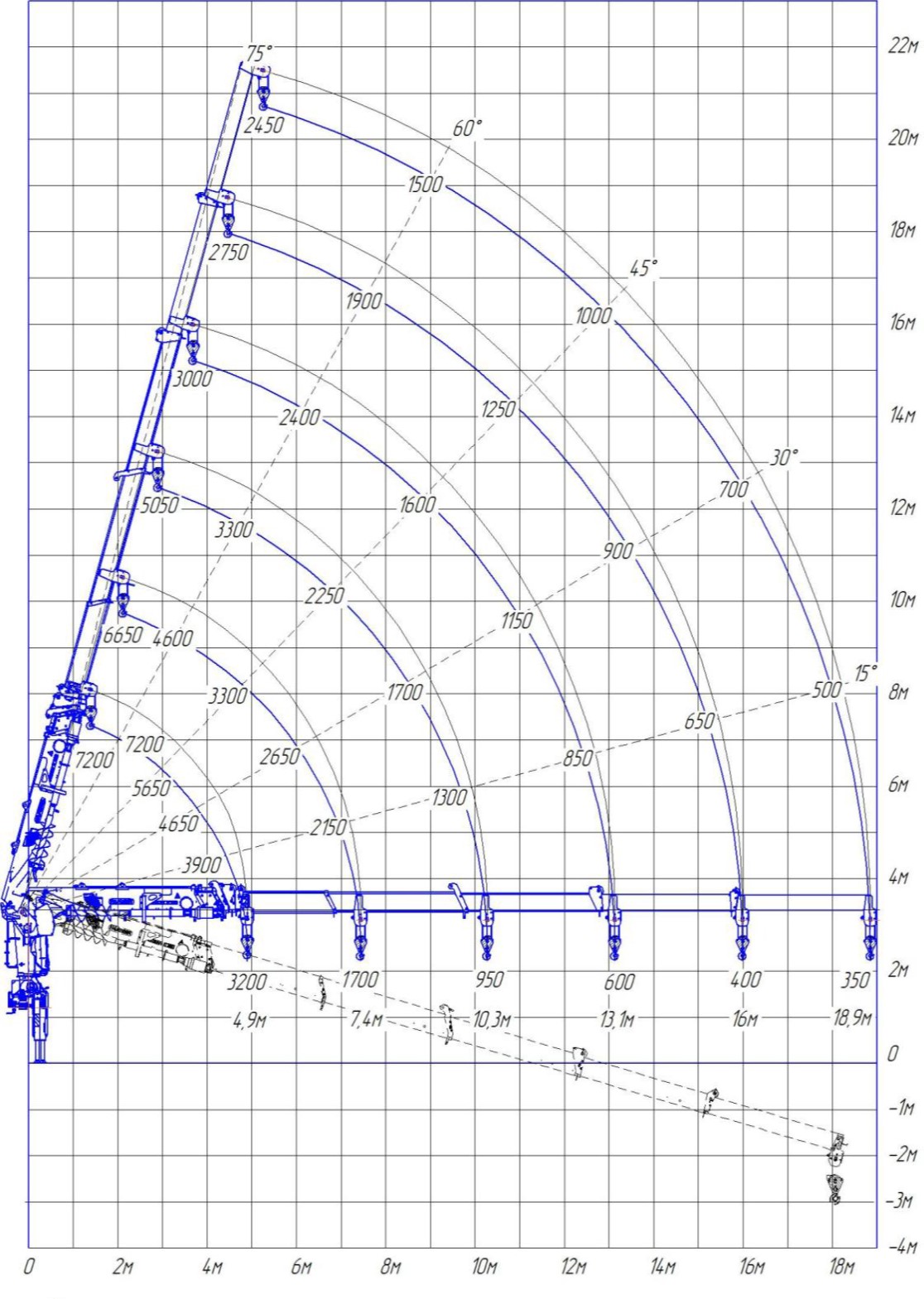 вылет 18,9 м, грузовой момент 21 тм, грузоподъемность 7200 кг