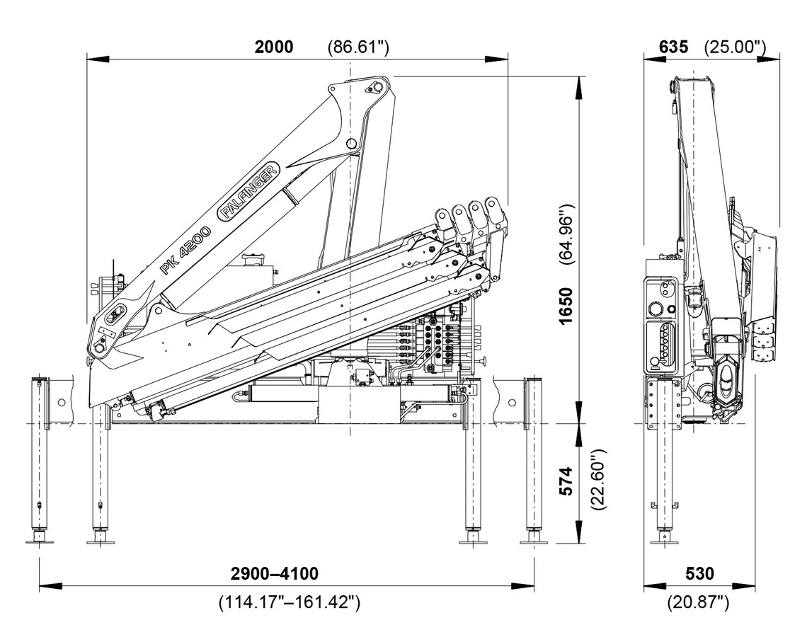 вылет 9.7 м, грузовой момент 3.9 тм, грузоподъемность 990 кг