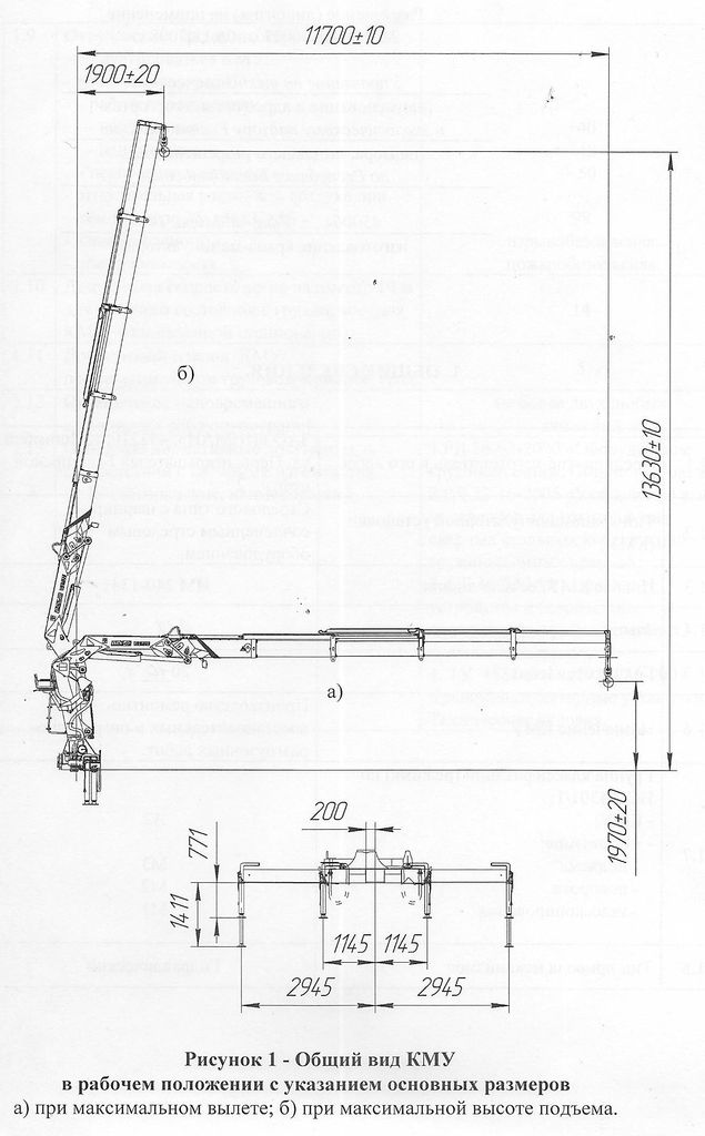 При собственном весе в 3155 кг манипулятор способен поднимать грузы до 8,6 тонн. Максимальный вылет стрелы в разложенном состоянии составляет 14,6 м.