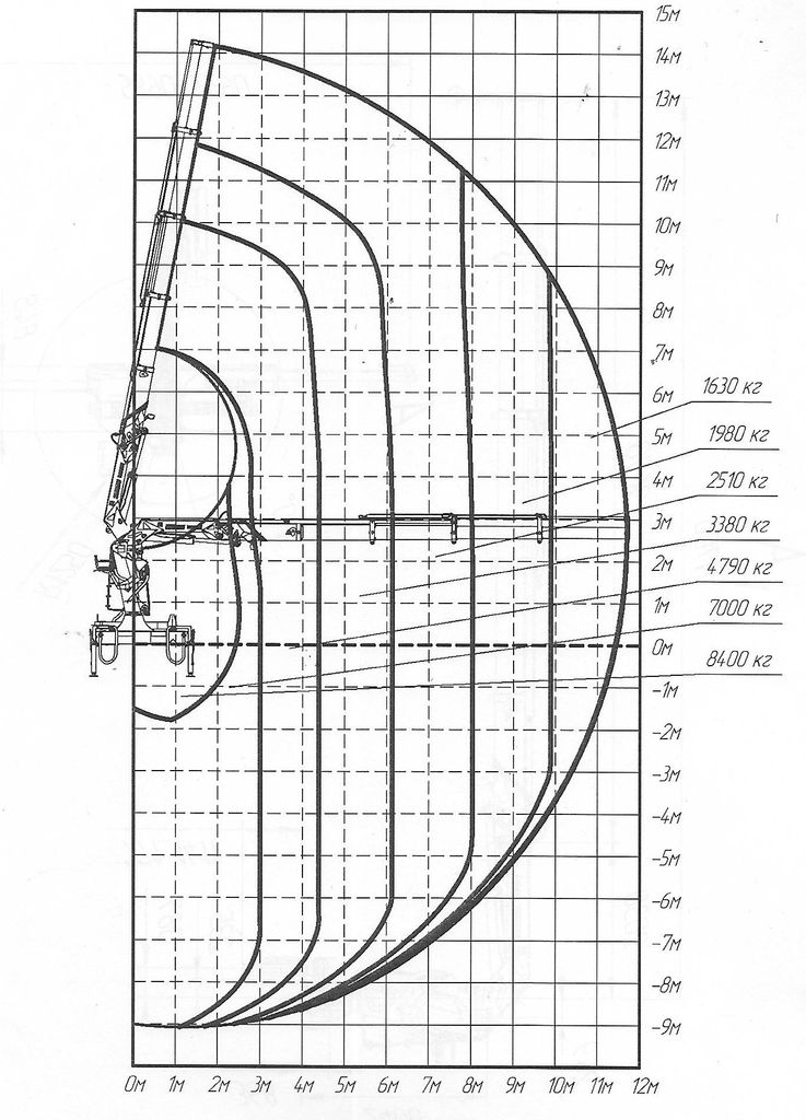 При собственном весе в 2630 кг манипулятор способен поднимать грузы до 8,4 тонн. Максимальный вылет стрелы в разложенном состоянии составляет 9 м.
