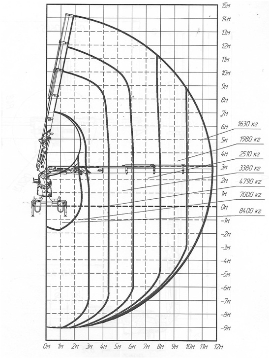 При собственном весе в 2630 кг манипулятор способен поднимать грузы до 8,4 тонн. Максимальный вылет стрелы в разложенном состоянии составляет 9 м.
