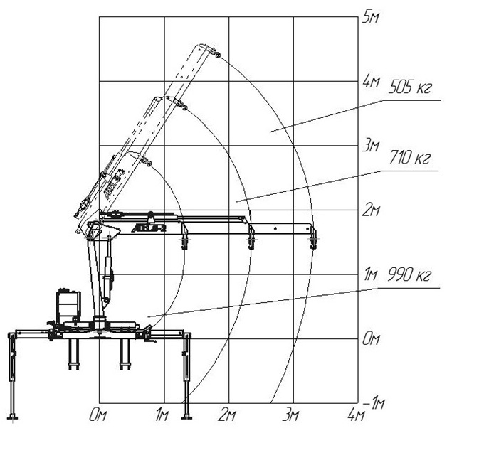 Стрела КМУ Z-образной схемой складывания изготавливается из шведской высокопрочной стали S700 фирмы Domex. Использование данного вида стали позволяет значительно повысить прочность конструкции, улучшить ее грузоподъемные характеристики и уменьшить массу установки. При собственном весе в 425 кг манипулятор способен поднимать грузы до 1 тонны. Максимальный вылет стрелы в разложенном состоянии составляет 3,5 м.