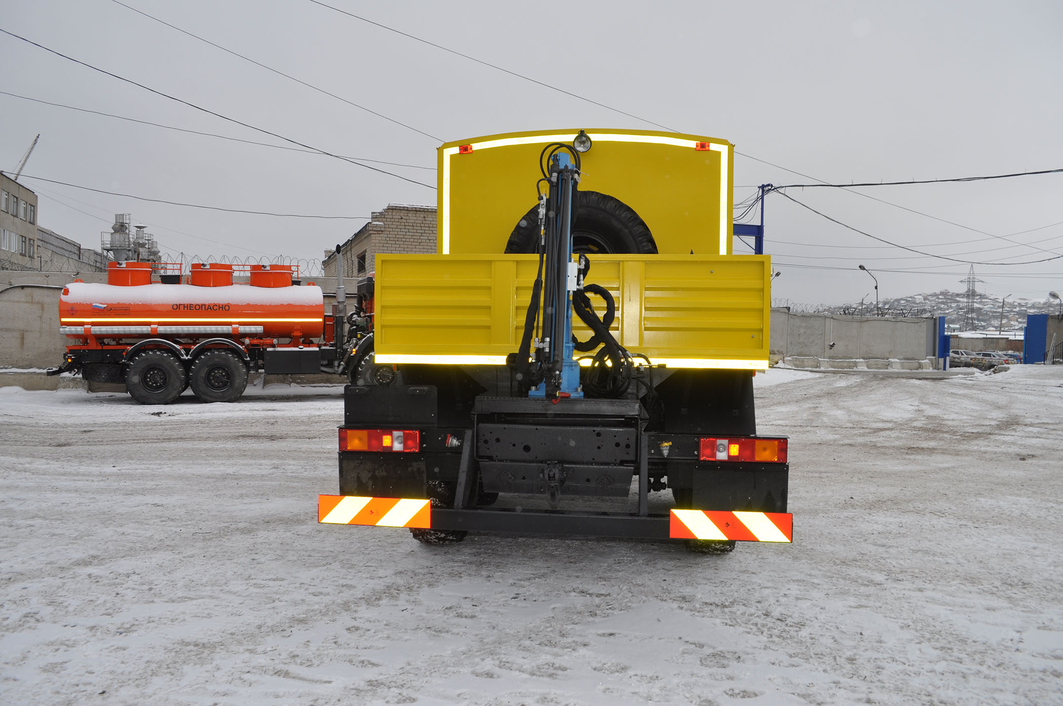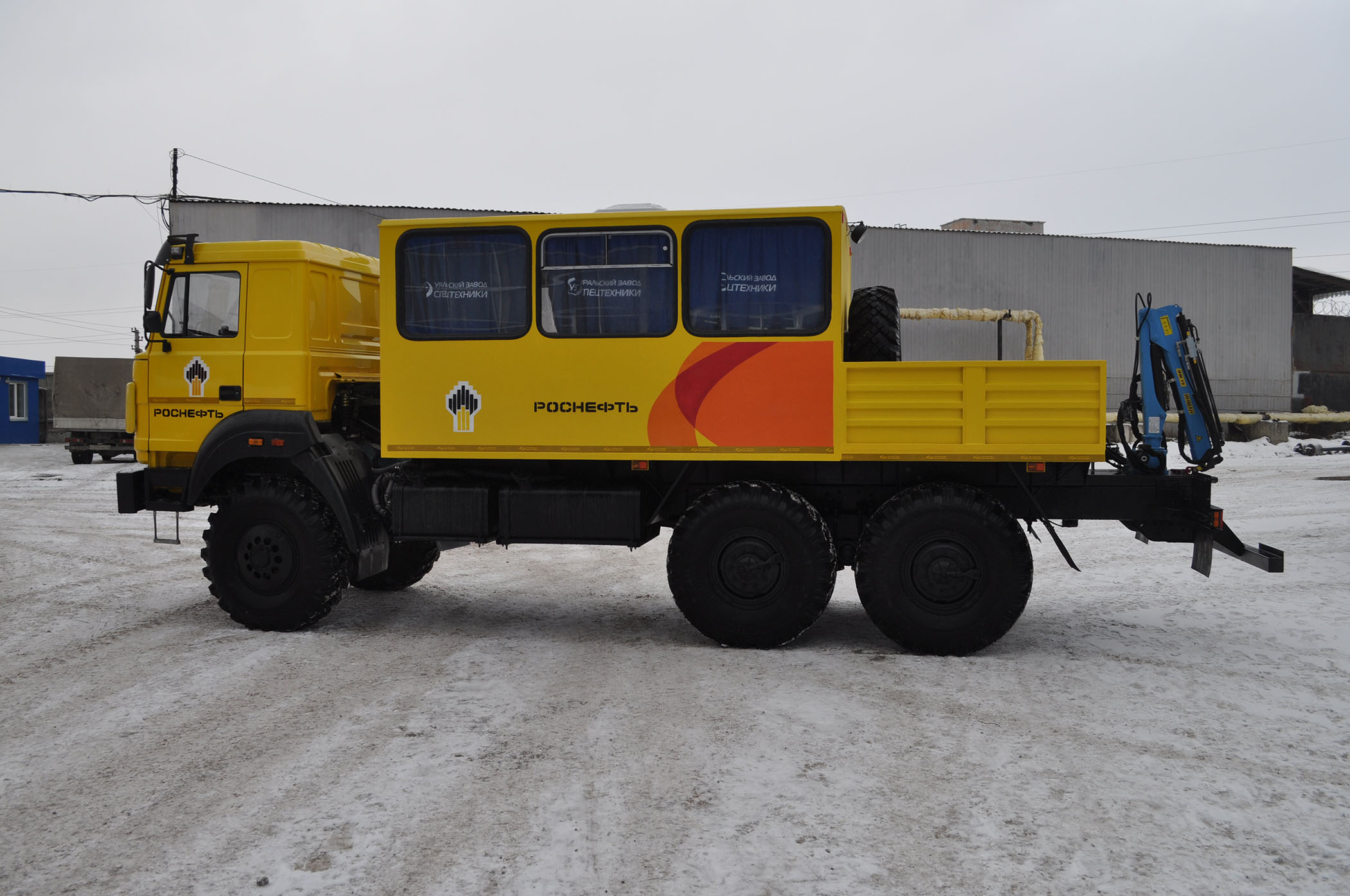 6х6, 275 л.с., коробка передач ЯМЗ-1105, бортовая платформа, мест в фургоне – 8 (+2 в кабине), г/п КМУ – 990 кг