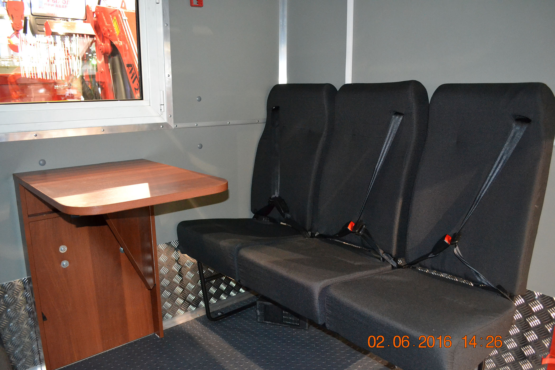 сиденье пассажирское трехместное, оборудованное трехточечными ремнями безопасности – 2 шт рундук для хранения инструмента – 1 шт переговорное устройство – 1 шт стол – 1 шт вешалка для одежды – 1 шт |