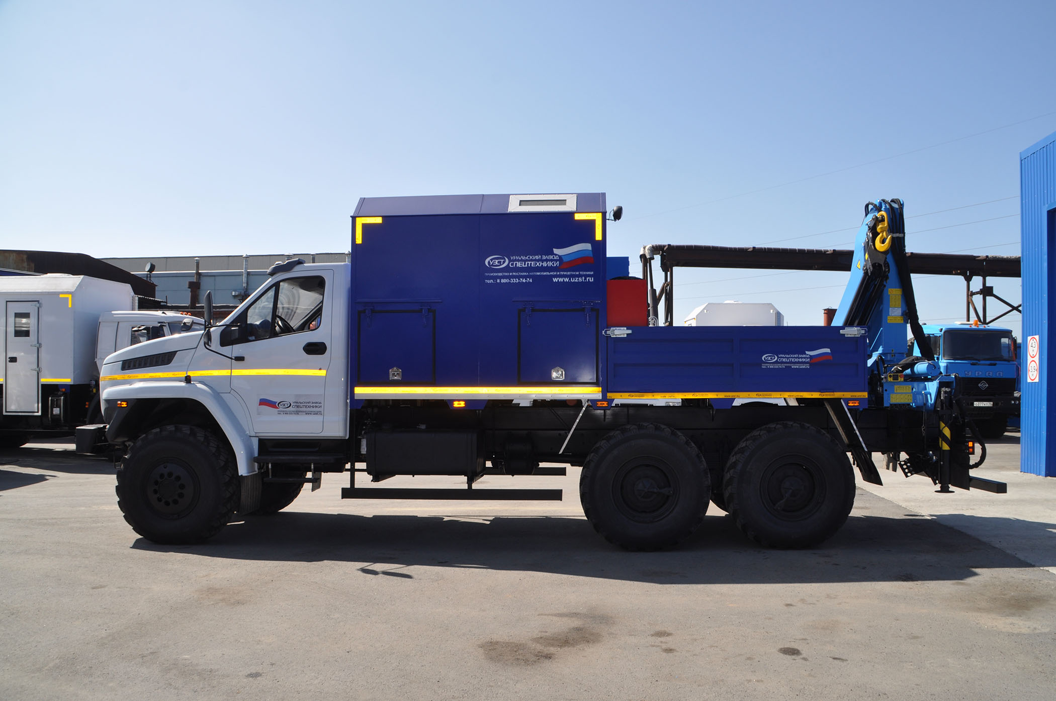 6х6, 275 л.с., коробка передач ЯМЗ-1105, технологический отсек, открытая бортовая платформа, генератор EG-202, сварочный выпрямитель, печь для электродов, верстак, макс. г/п КМУ – 6 т.
