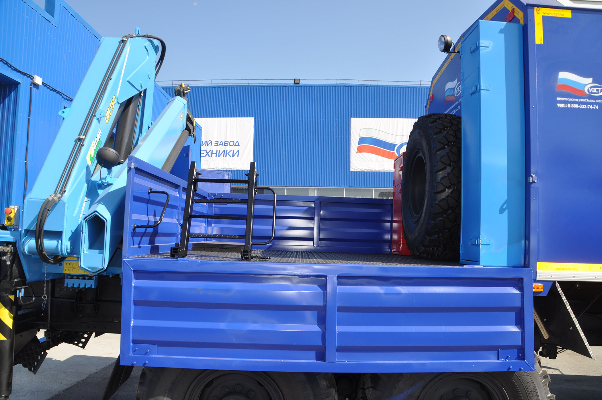 6х6, 230 л.с., коробка передач ЯМЗ-2361, технологический отсек, открытая бортовая платформа, генератор EG-202, вертикально-сверлильный станок, точильно-шлифовальный станок, бочка 200 л, бак для масла, сварочный выпрямитель, верстак, умывальник, макс. г/п КМУ – 4 т.
