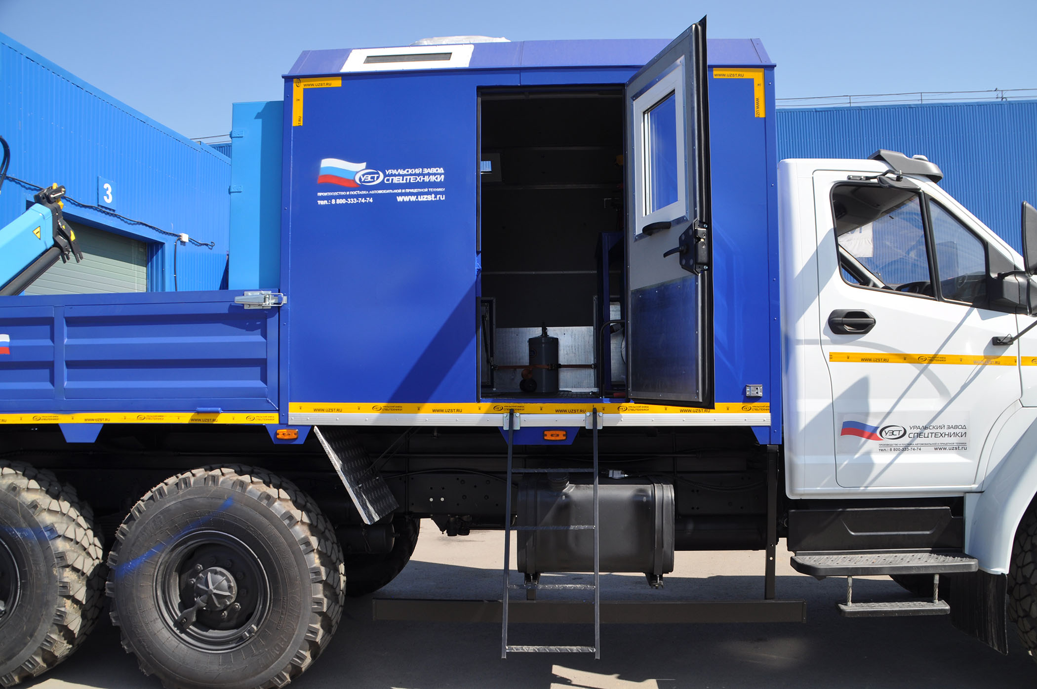 6х6, 230 л.с., коробка передач ЯМЗ-2361, пассажирский (6 мест) и технологический отсеки, открытая бортовая платформа, генератор EG-202, вертикально-сверлильный станок, точильно-шлифовальный станок, верстак, сварочный выпрямитель, стол, диван-рундук, макс. г/п КМУ – 6 т.