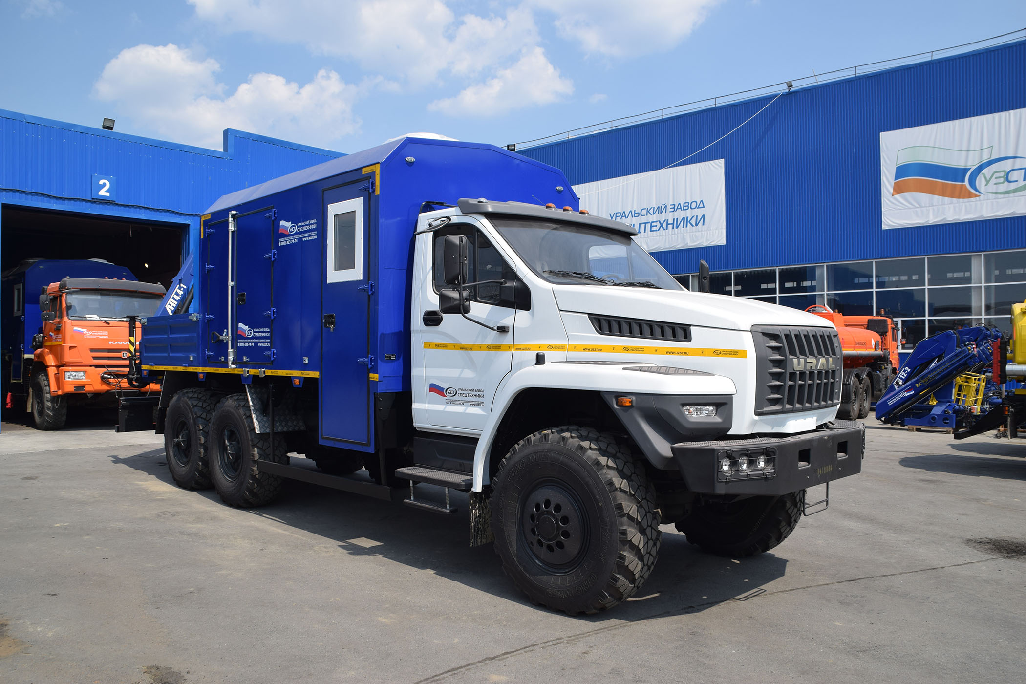 6х6, 275 л.с., коробка передач ЯМЗ-1105, пассажирский (4 мест) и технологический отсеки, открытая бортовая платформа, генератор EG-202, сверлильный станок, точильно-шлифовальный станок, токарный станок, сварочный выпрямитель, верстак, стол, макс. г/п КМУ – 2 т.