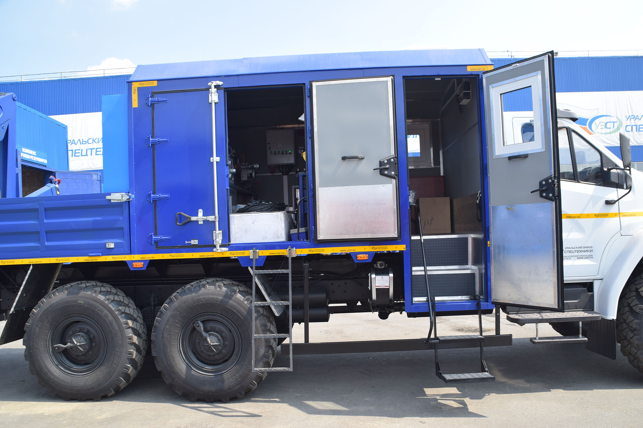 6х6, 230 л.с., коробка передач ЯМЗ-2361, сдвоенная кабина, технологический отсек, открытая бортовая платформа, точильно-шлифовальный станок, сварочный выпрямитель, верстак, диван-рундук, макс. г/п КМУ – 6 т.