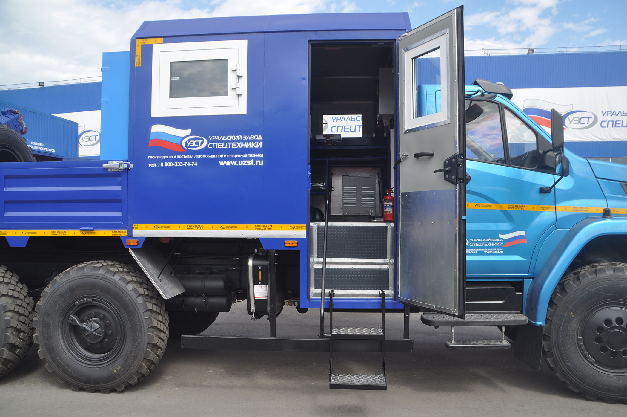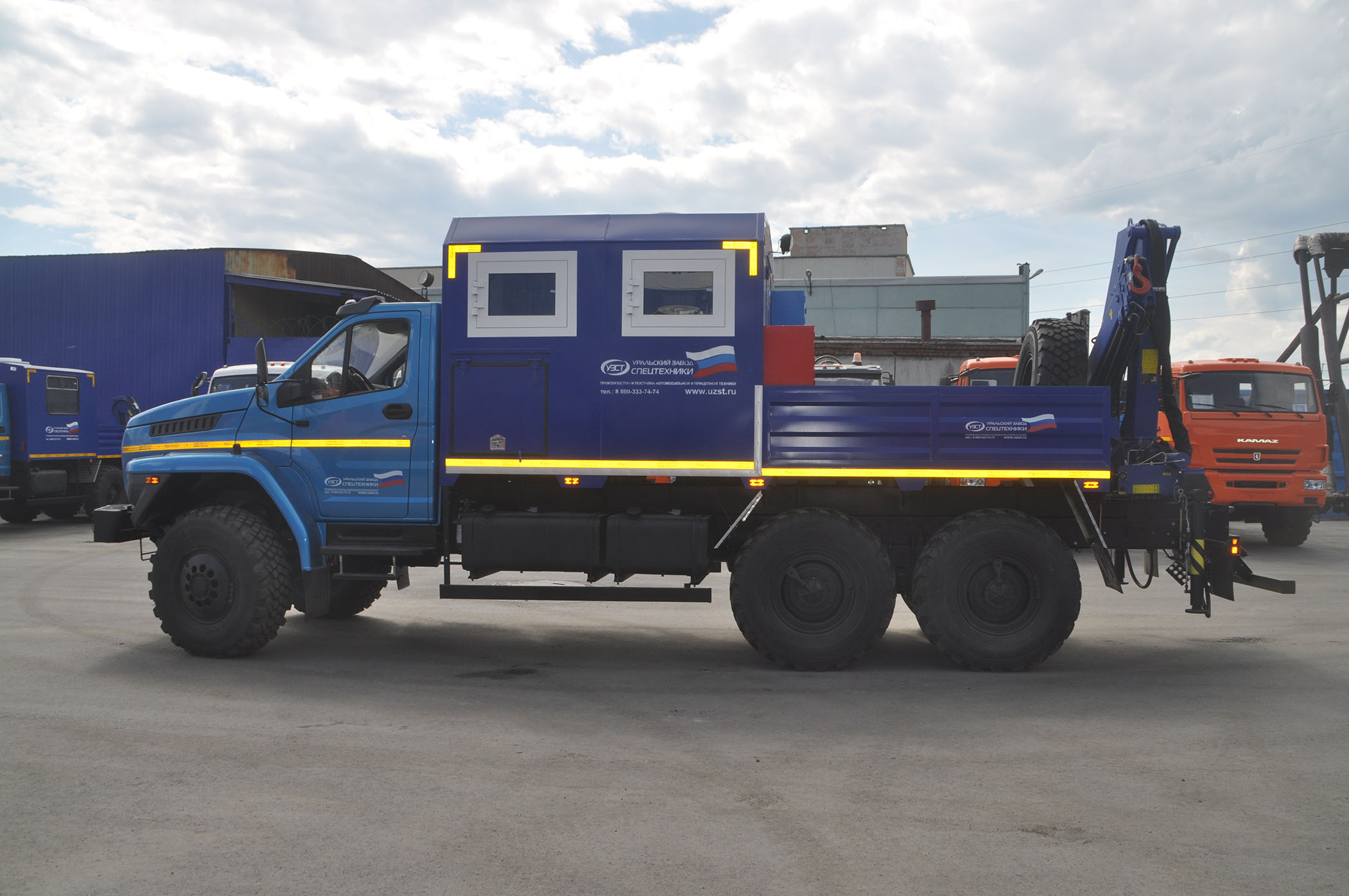 6х6, 275 л.с., коробка передач ЯМЗ-1105, пассажирский (6 мест) и технологический отсеки, открытая бортовая платформа, генератор EG-202, сварочный выпрямитель, верстак, стол, диван-рундук, макс. г/п КМУ – 6 т.