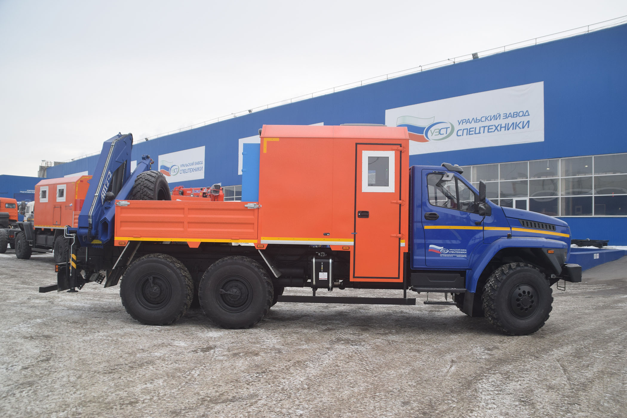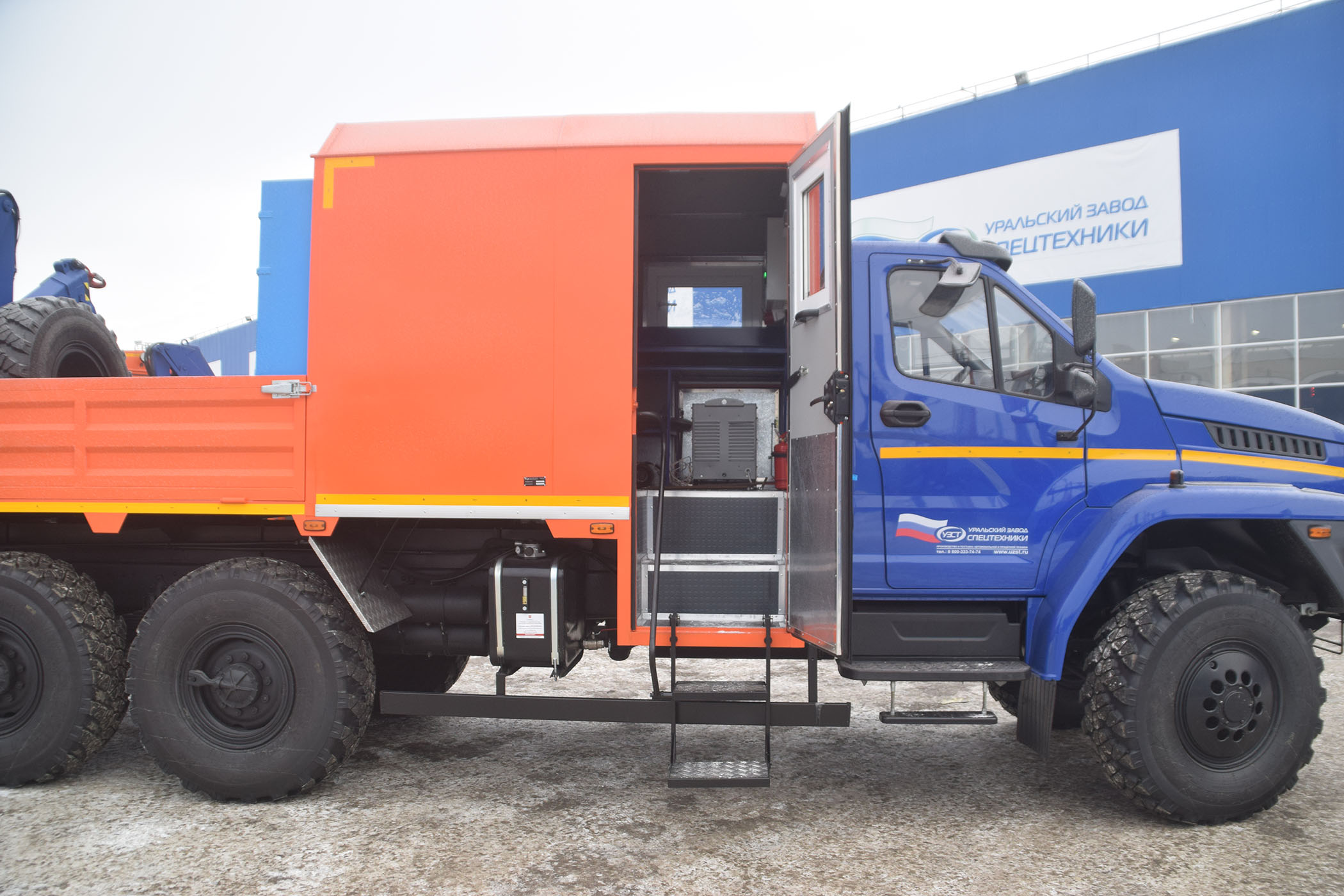 6х6, 275 л.с., коробка передач ЯМЗ-1105, пассажирский (6 мест) и технологический отсеки, открытая бортовая платформа, генератор EG-202, сварочный выпрямитель, верстак, стол, диван-рундук, макс. г/п КМУ – 6 т.