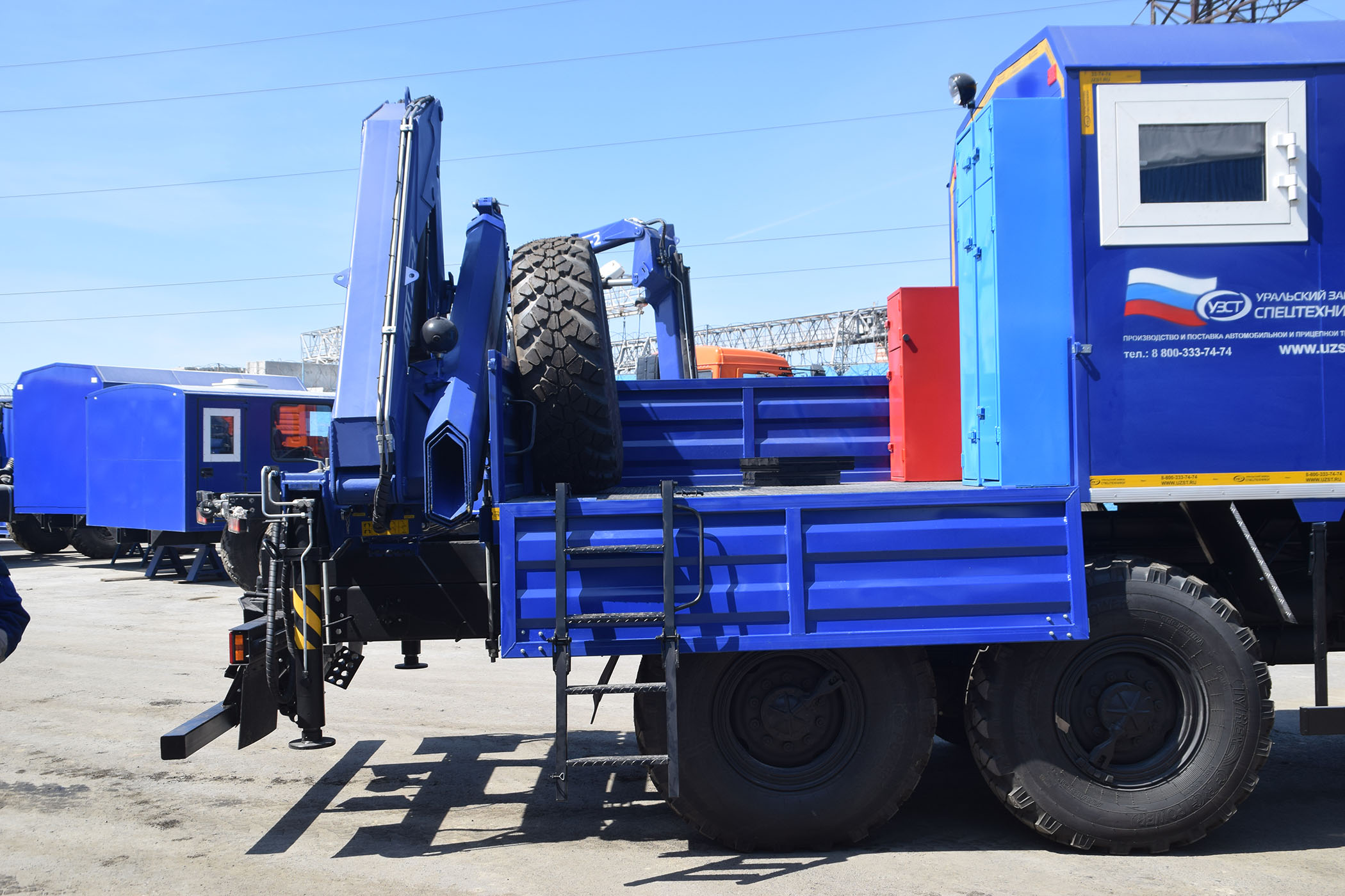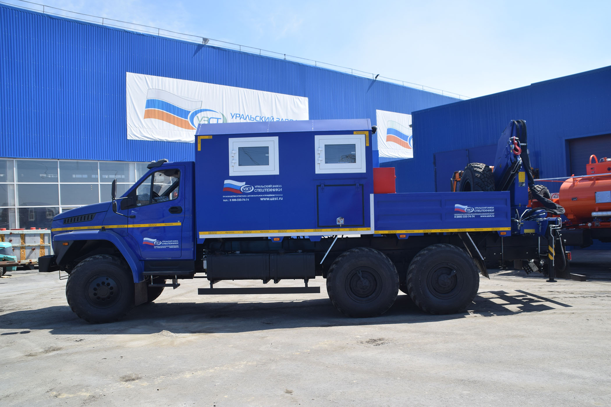 6х6, 275 л.с., коробка передач ЯМЗ-1105, пассажирский (6 мест) и технологический отсеки, открытая бортовая платформа, генератор EG-202, сварочный выпрямитель, верстак, стол, диван-рундук, макс. г/п КМУ – 6 т.