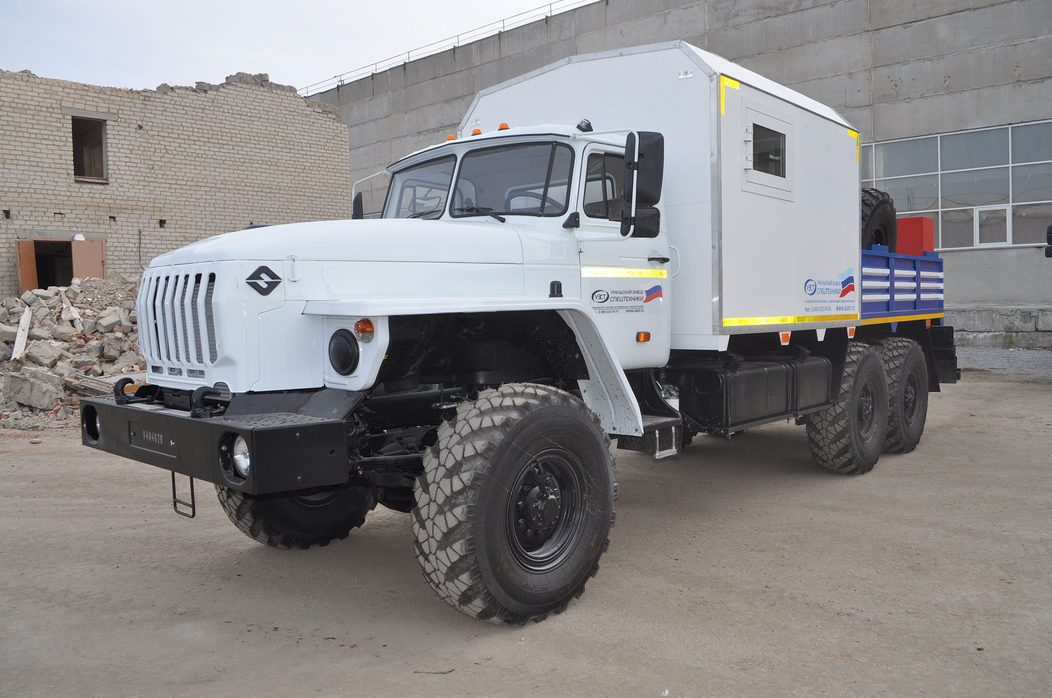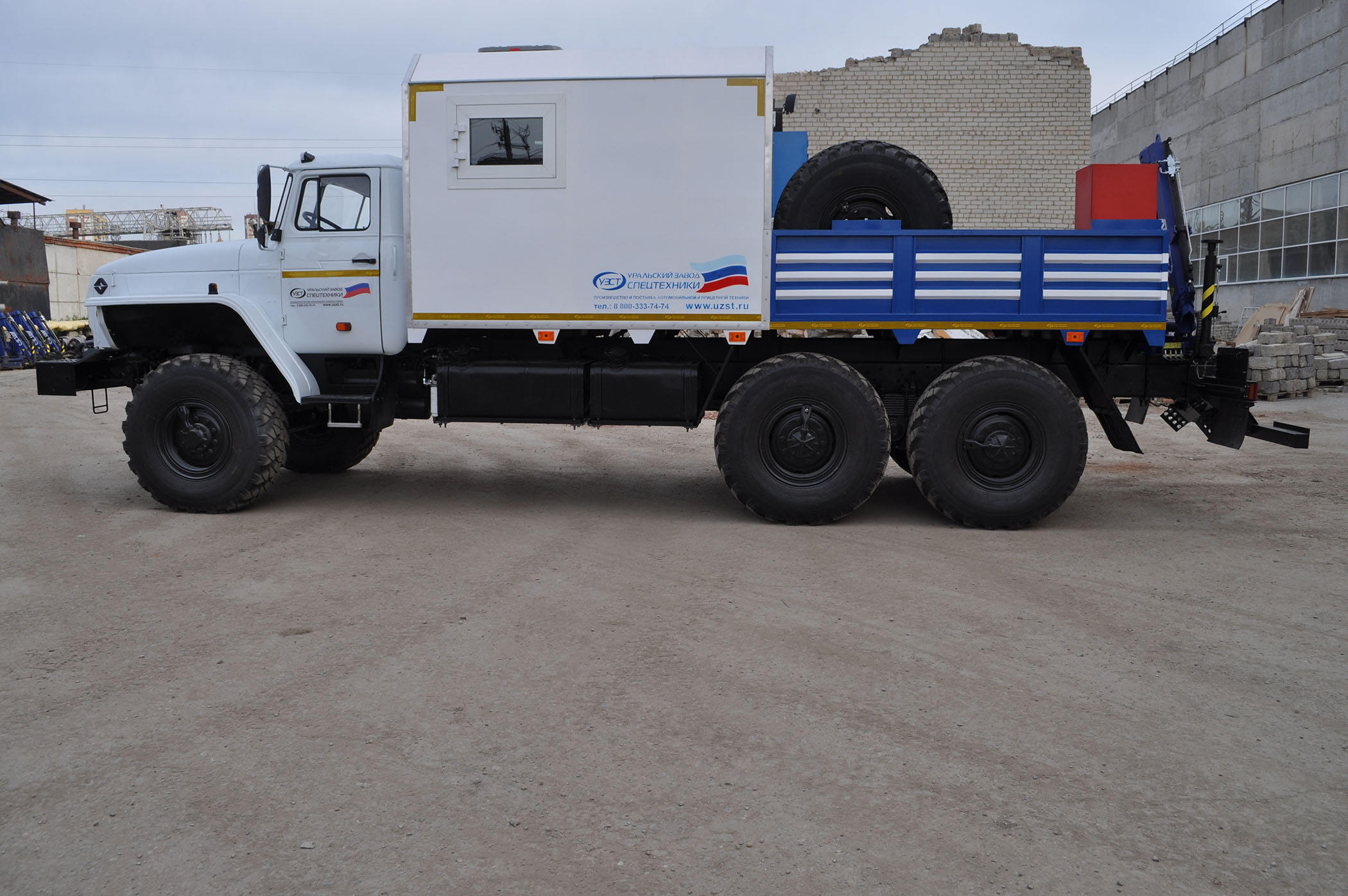 6х6, 230 л.с., коробка передач ЯМЗ-2361, пассажирский (6 мест) и технологический отсеки, открытая бортовая платформа, генератор EG-202, вертикально-сверлильный станок, точильно-шлифовальный станок, верстак, сварочный выпрямитель, стол, диван-рундук, макс. г/п КМУ – 6 т.