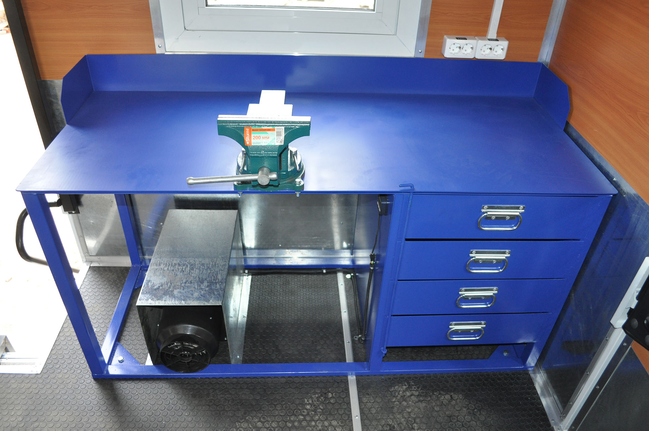 распределительный щит; разъем для подключения к внешнему источнику питания 380В (20кВт); розетки 220В - 2 шт.; розетки 380В - 1 шт.; диван-рундук - 1 шт.; верстак с выдвижными ящиками - 1 шт.; тисы 200 мм. - 1 шт. |