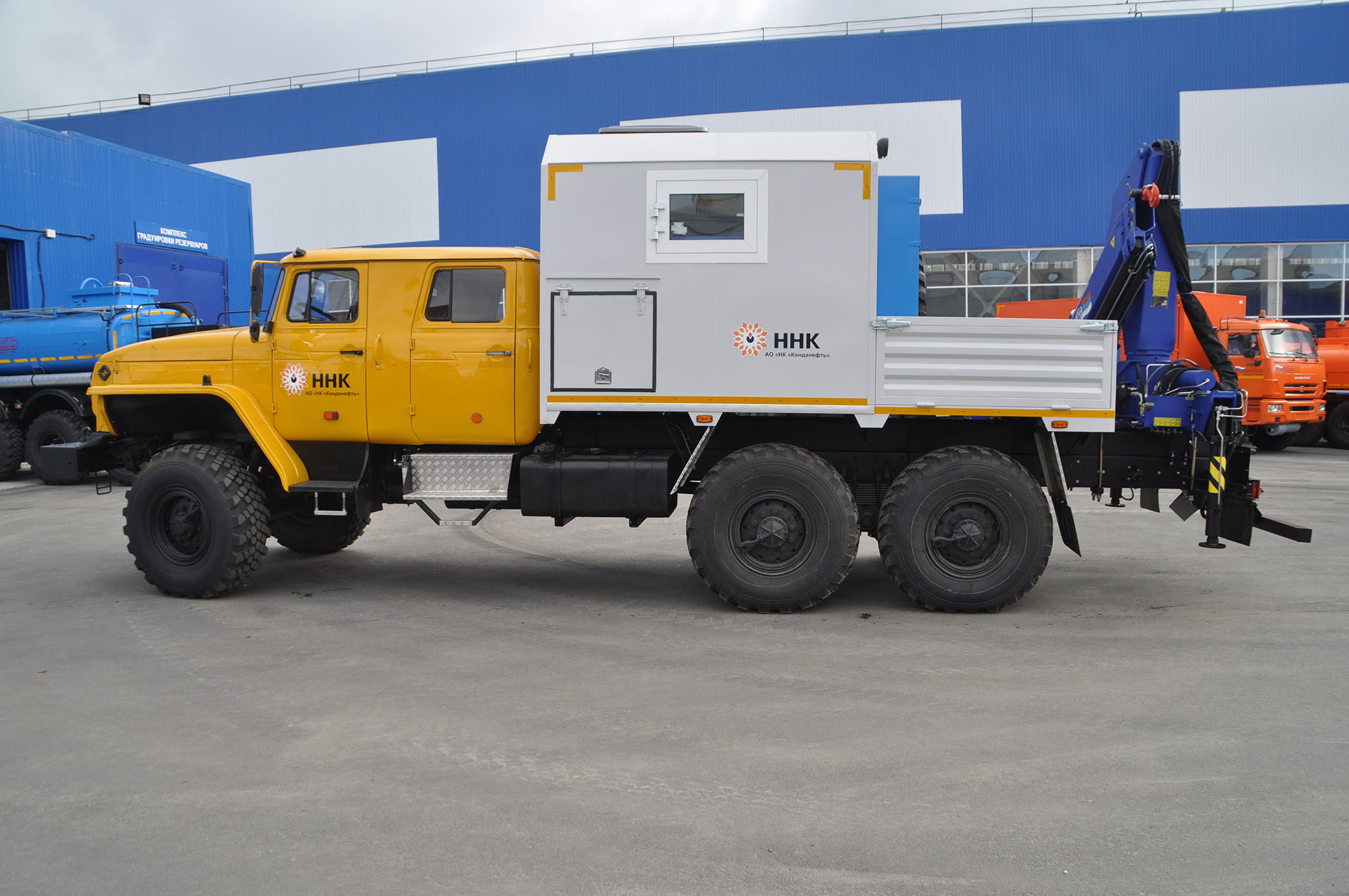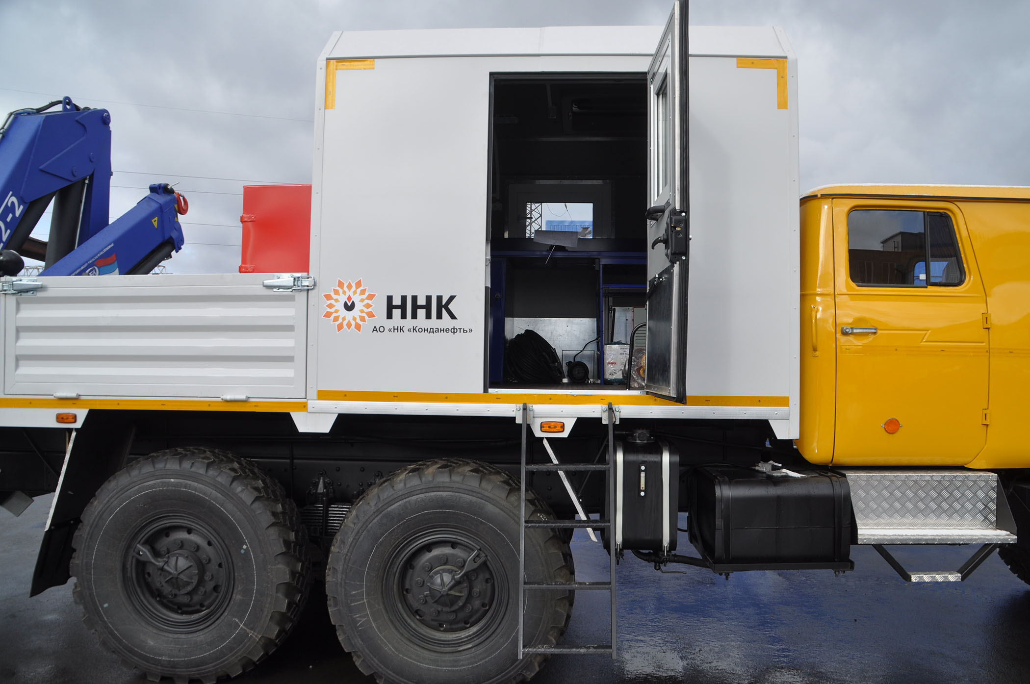 6х6, 230 л.с., коробка передач ЯМЗ-2361, сдвоенная кабина, технологический отсек, открытая бортовая платформа, точильно-шлифовальный станок, сварочный выпрямитель, верстак, диван-рундук, макс. г/п КМУ – 6 т.