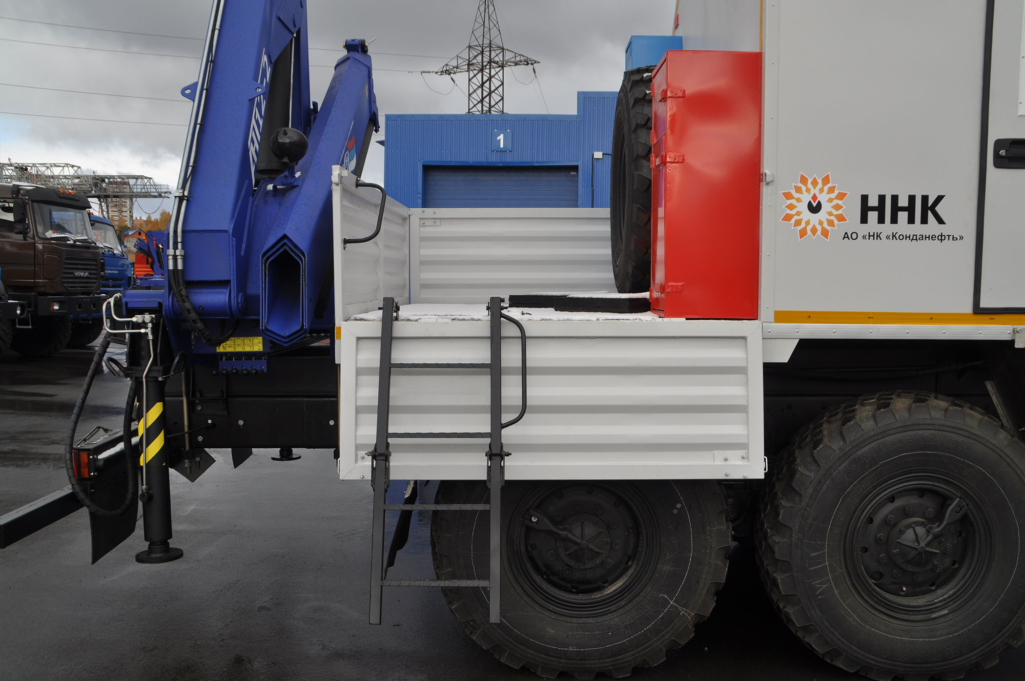 6х6, 230 л.с., коробка передач ЯМЗ-2361, технологический отсек, открытая бортовая платформа, генератор EG-202, вертикально-сверлильный станок, точильно-шлифовальный станок, бочка 200 л, бак для масла, сварочный выпрямитель, верстак, умывальник, макс. г/п КМУ – 4 т.