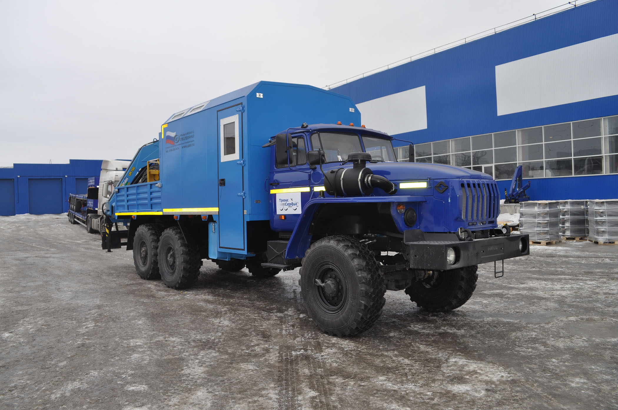 6х6, 275 л.с., коробка передач ЯМЗ-1105, пассажирский (4 места) и технологический отсеки, открытая бортовая платформа, генератор EG-202, вертикально-сверлильный станок, точильно-шлифовальный станок, сварочный выпрямитель, печь для электродов, верстак, стол, люлька, макс. г/п КМУ – 6,05 т.