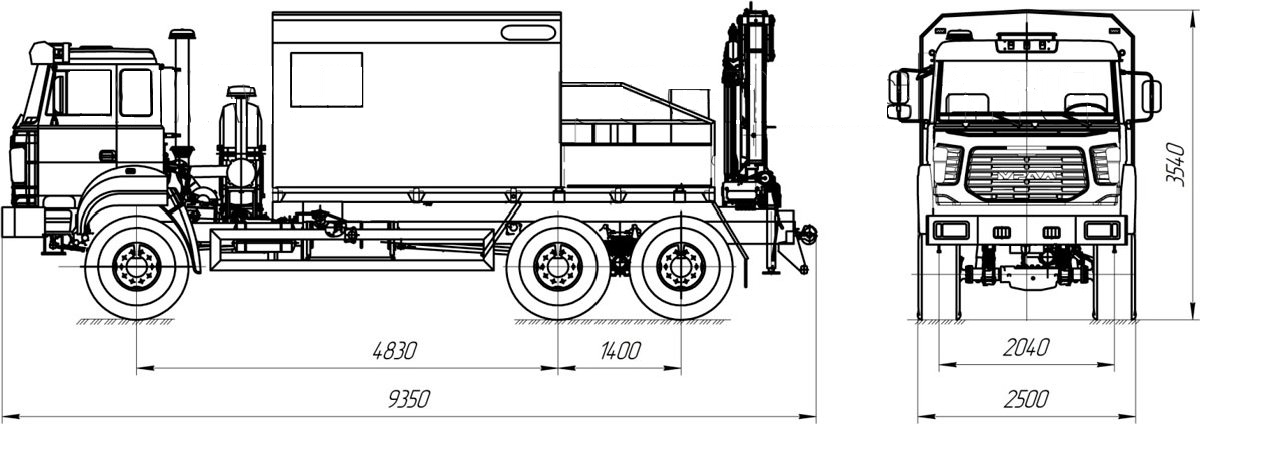 6х6, 275 л.с., коробка передач ЯМЗ-1105, пассажирский (4 места) и технологический отсеки, открытая бортовая платформа, генератор EG-202, сварочный выпрямитель, верстак, стол, шкаф, диван-рундук, люлька, макс. г/п КМУ – 6,05 т.