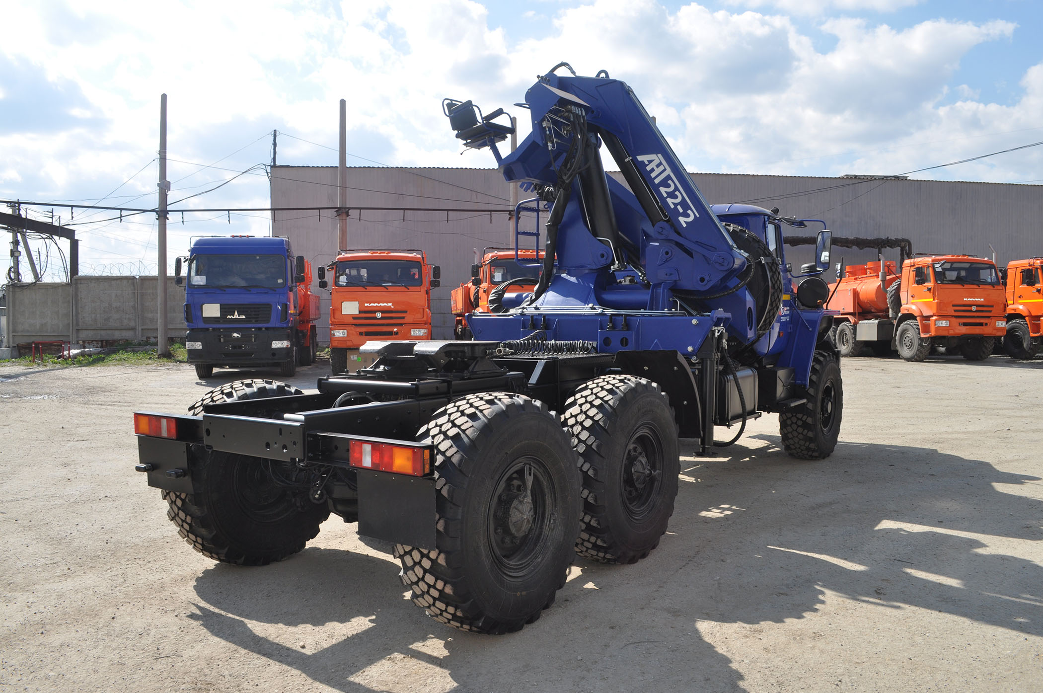 6х6, 230 л.с., коробка передач ЯМЗ-2361, КМУ: грузовой момент 22 тм, вылет 7,6 м, г/п 7,3 т.