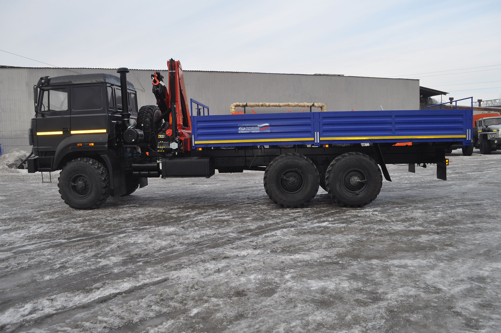 6х6, 275 л.с., коробка передач ЯМЗ-1105, КМУ: грузовой момент 12,1 тм, вылет 8,40 м, г/п 6,05 тн
