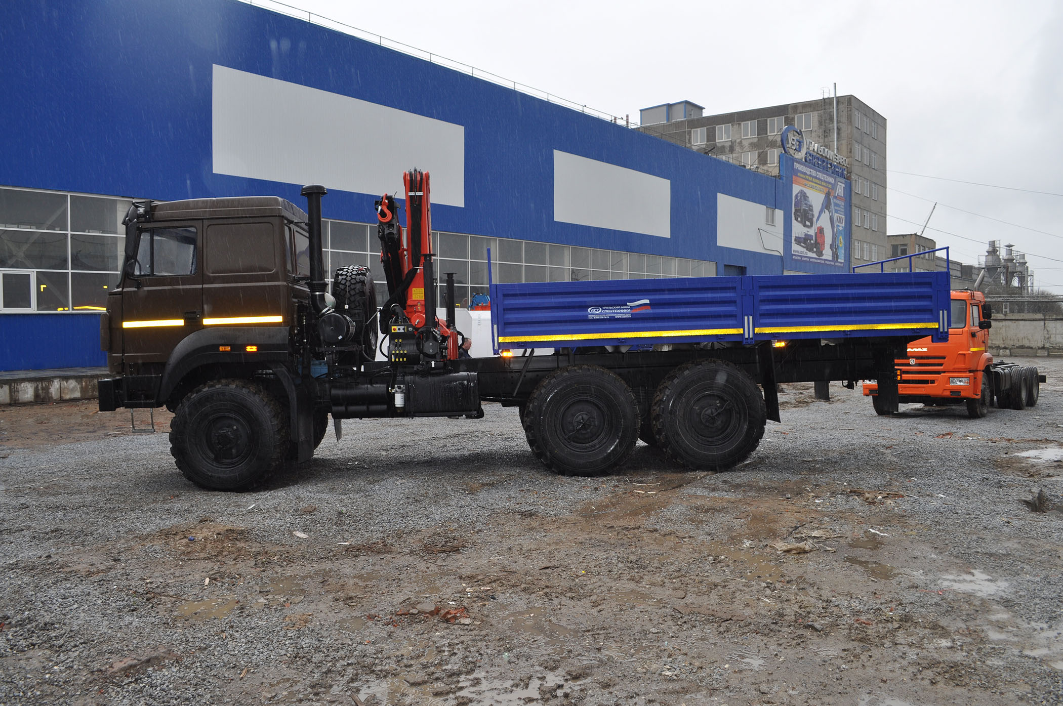 6х6, 275 л.с., коробка передач ЯМЗ-1105, КМУ: грузовой момент 8,5 тм, вылет стрелы 8,25 м, г/п 4 т.