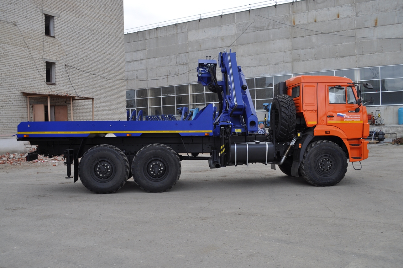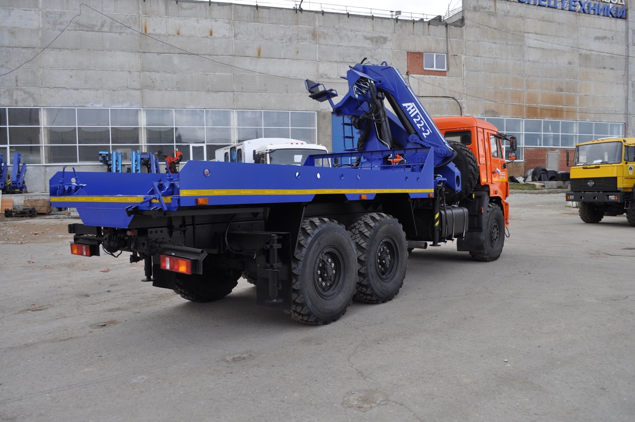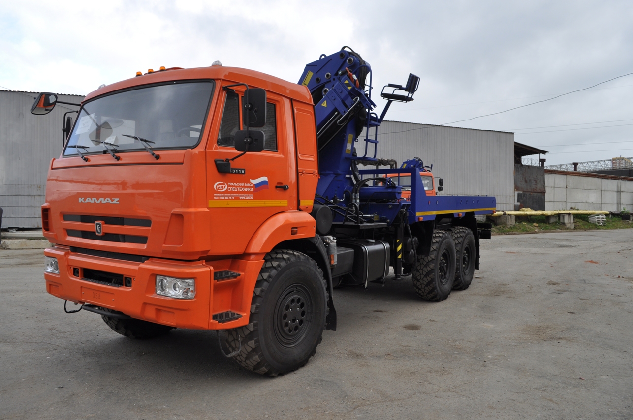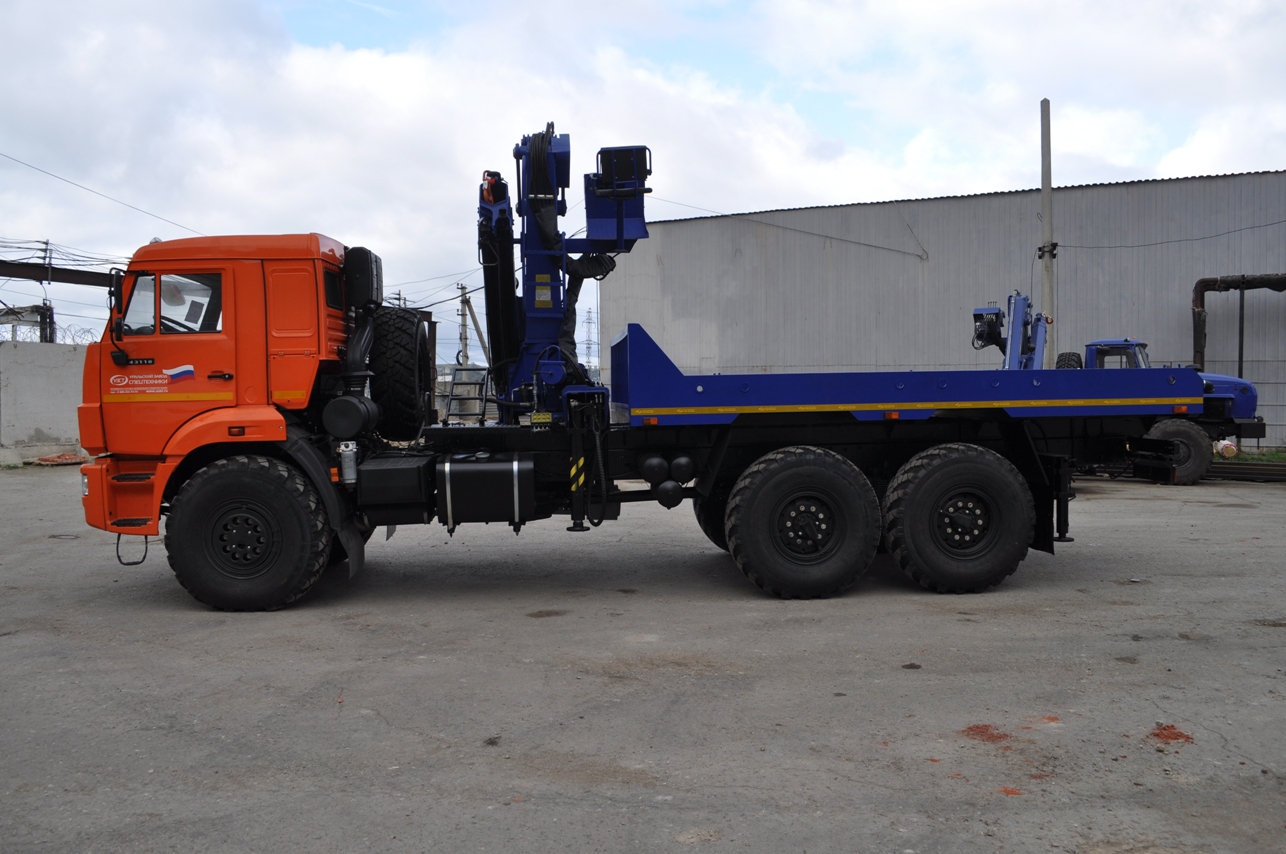 КАМАЗ-43118 со спальным местом, металлическая платформа для перевозки двух кабельных барабанов и насосов, краново-манипуляторная установка АНТ 22-2 грузоподъемностью до 7300 кг и с вылетом до 7,6 метра с управлением с сиденья (верхний пост), средства крепежа, средства безопасности